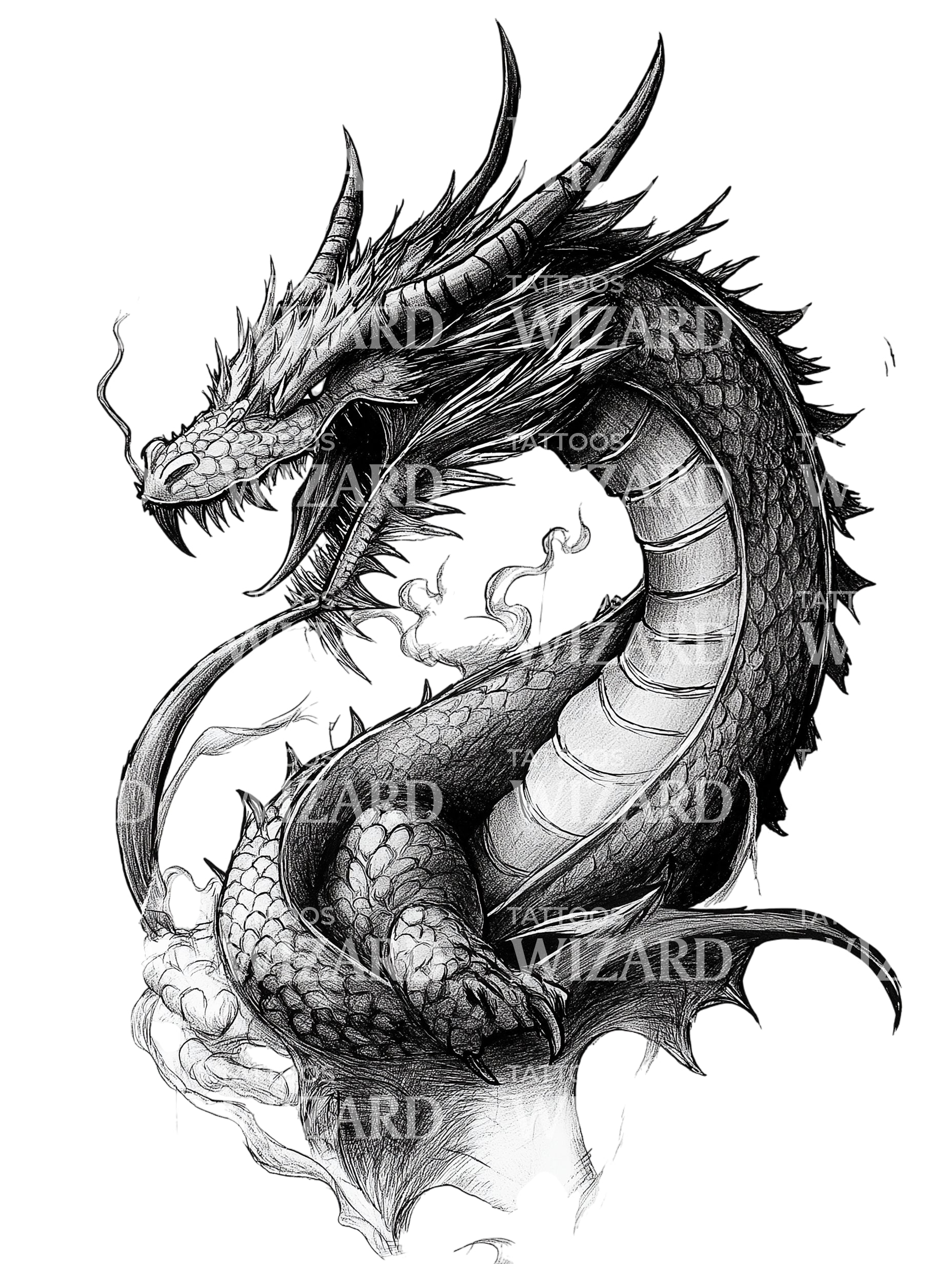 释放内心的野兽,尽享这款传奇的黑灰色纹身设计。它展现了一条凶猛的龙,象征着力量与强大,缠绕在熊熊烈焰之中。这种蛇形生物散发出令人惊叹的大胆气息,成为无与伦比的力量与神秘的象征。