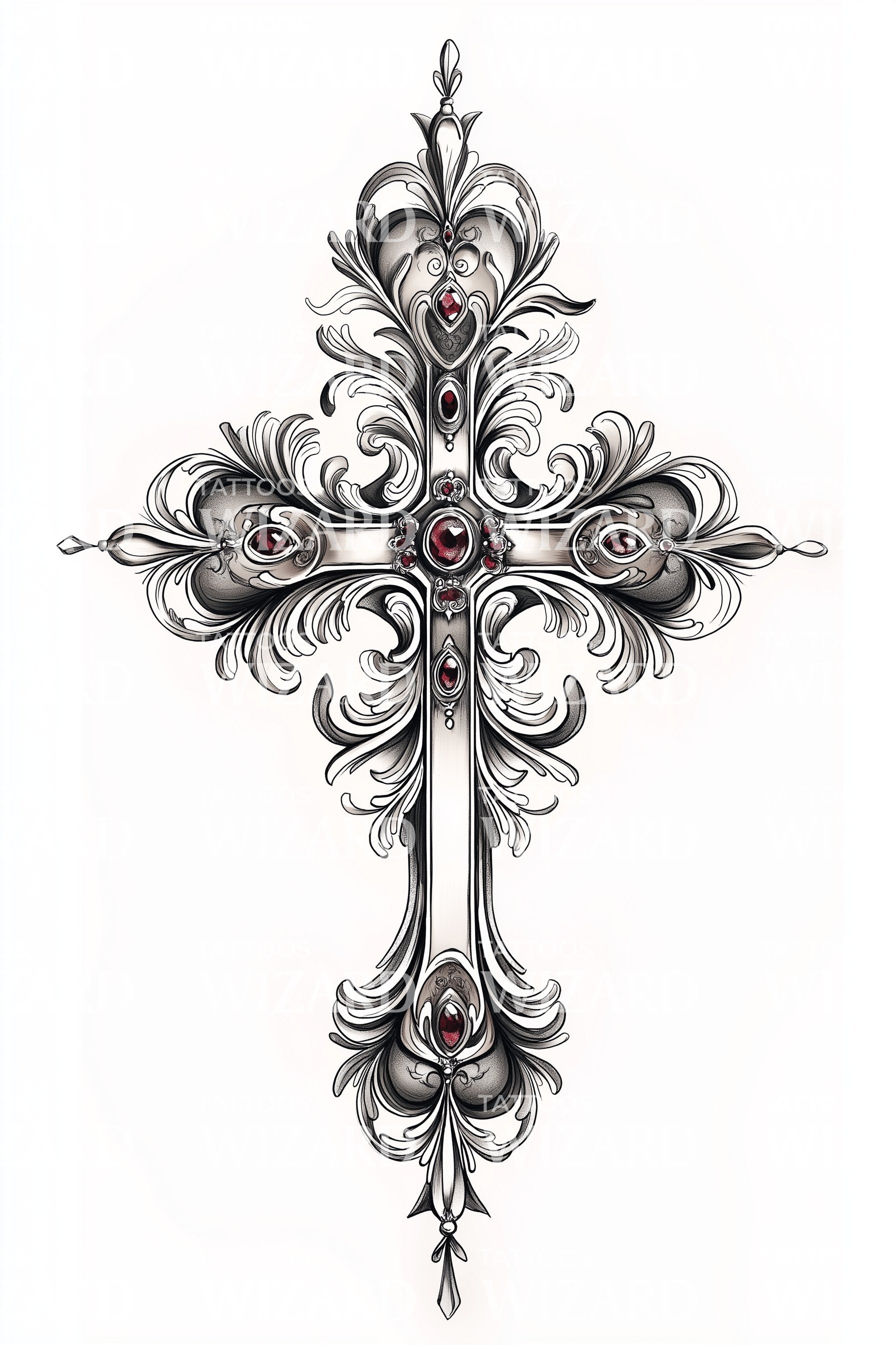 这款精美的装饰性纹身设计将细工花纹与信仰交织成一枚令人惊叹的银色十字架。每一道曲线都回响着虔诚的故事,精心雕琢于闪耀的银色光泽中。设计中复杂的装饰细节彰显了对信念与坚韧的庄严誓言。释放你的精神力量,以这款华丽的信仰致敬纹身表达内心的信仰。
