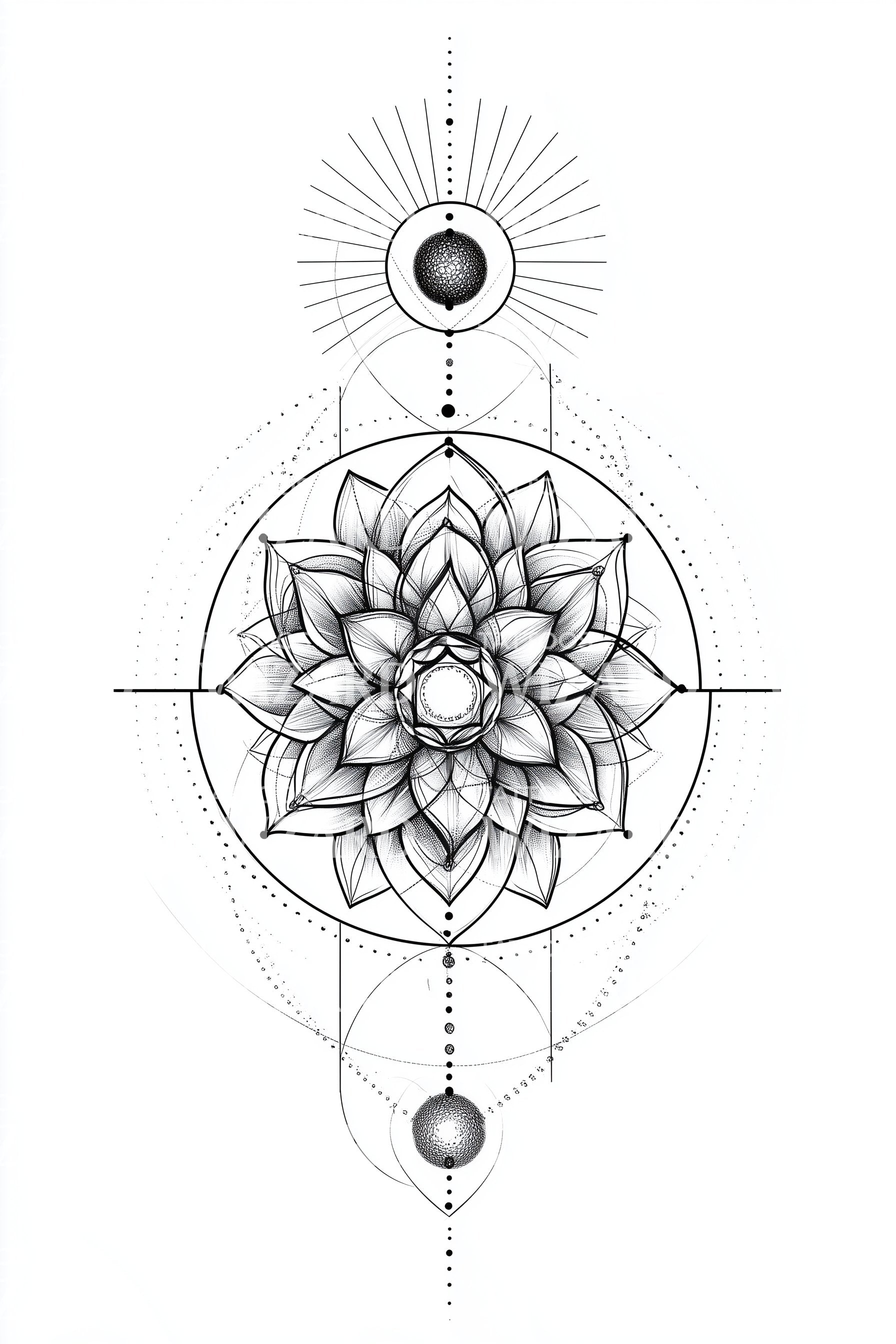 沉浸于神圣的宁静之中,这款复杂的纹身设计将精致的蕾丝与装饰性花丝元素交织成引人注目的曼陀罗形状。以优雅的莲花为中心,设计散发出神圣之美,回响着平静与优雅的气息。非常适合偏爱精致而温柔美学的您。