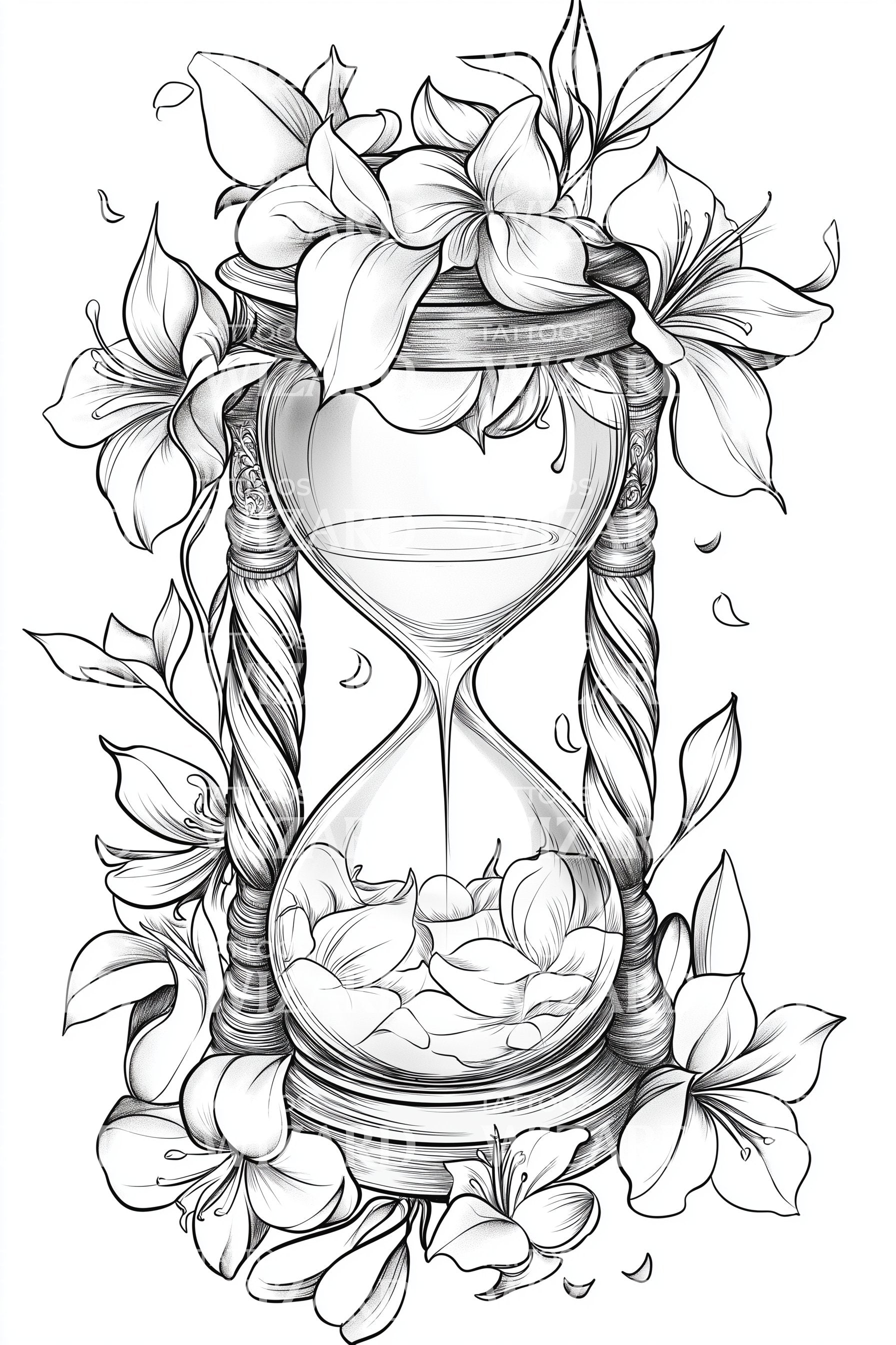 体验这款细线纹身设计中捕捉到的永恒之美。结合迷人的沙漏图案和精致的花卉点缀,它象征着时间的短暂本质。其素描般的细节呈现出柔和的对比,完美适合偏爱细腻而复杂身体艺术的你。
