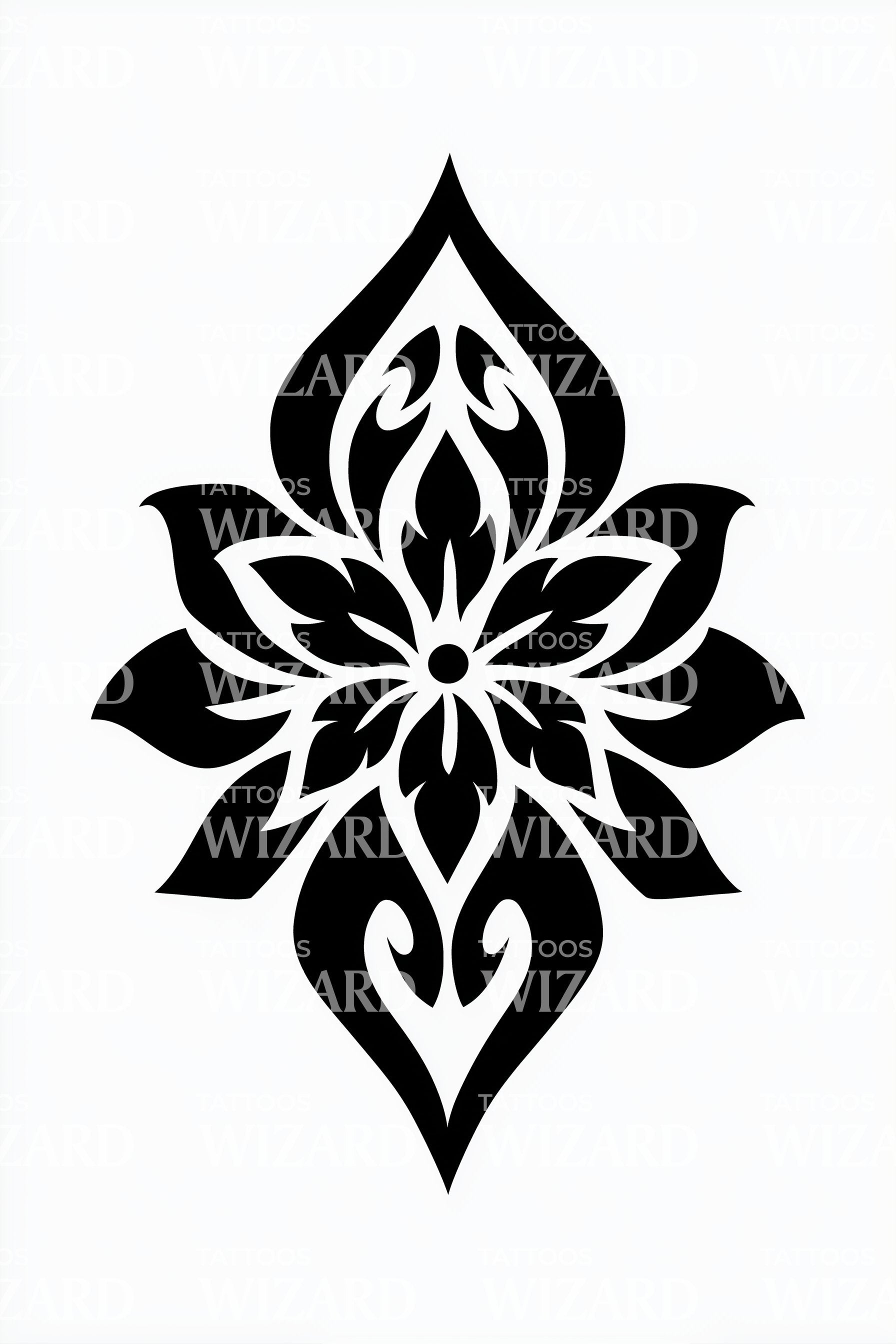 用这款装饰性黑色纹身设计点燃你的风格,巧妙融合锐利的钻石形状、复杂的花瓣图案和炽烈的火焰。这件作品散发出强烈的对比和几何魅力,彰显出引人注目的个性。拥抱大胆而迷人的持久黑色墨水魅力。
