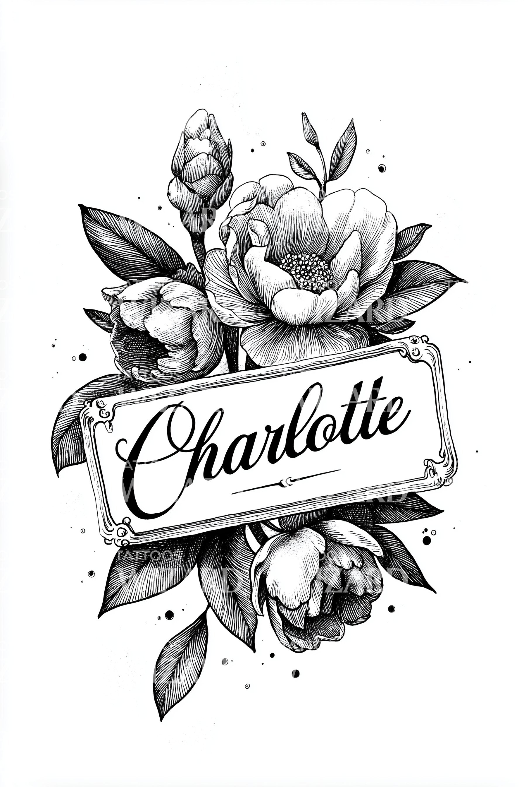 Graceful botanical linework frames a vintage banner, where Charlotte is rendered in flowing script amid lush peony blooms and dew-speckled leaves. Peonies evoke devotion, renewal, and honor, making the name feel timeless and treasured. Wearer carries a calm, blooming confidence, like a garden kept close to the heart.