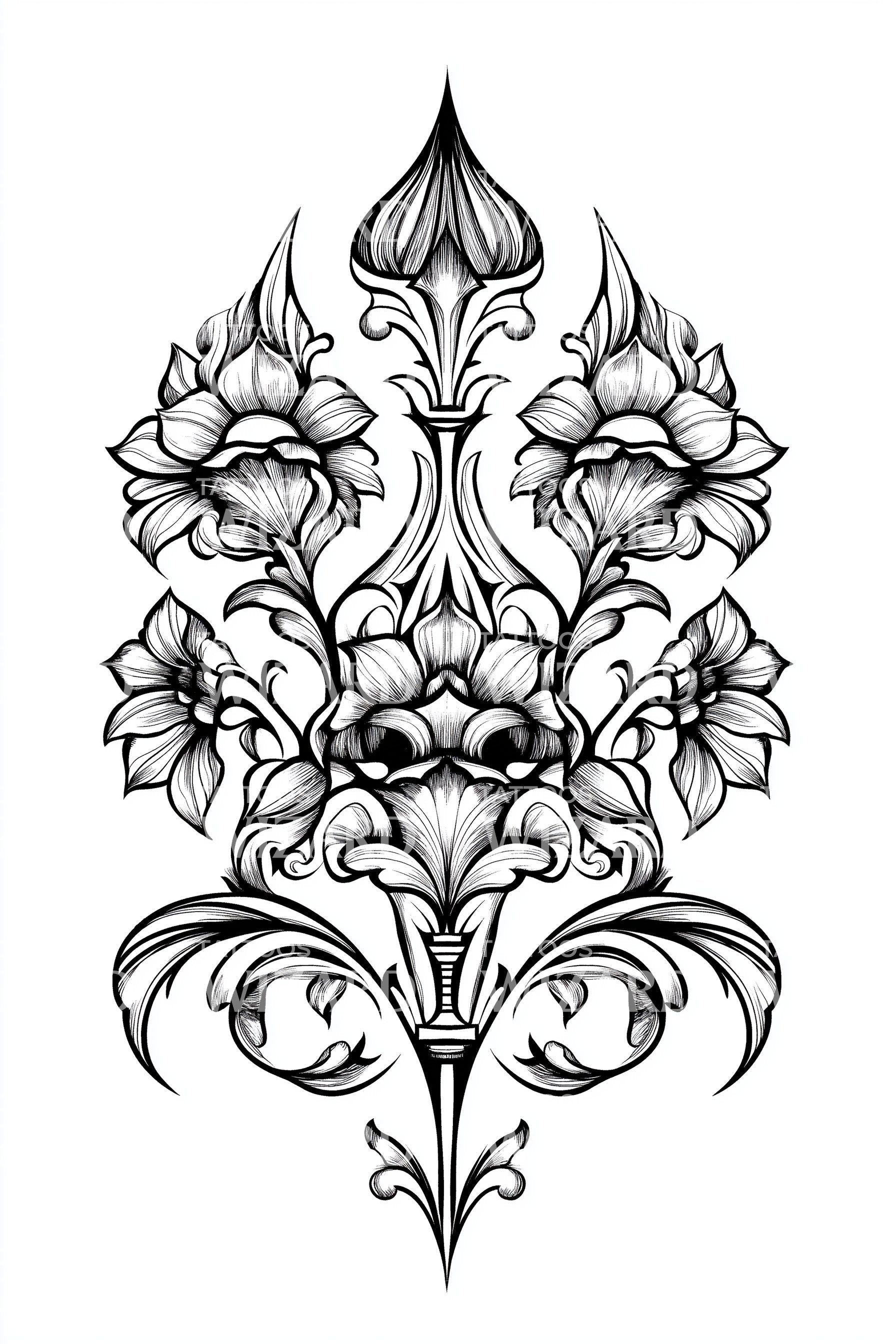 用这款装饰性纹身设计提升你的肌肤画布。灵感源自巴洛克艺术的宏伟,这件对称作品展现了精致的纹章,巧妙点缀着装饰性的花卉。花卉装饰增添了清新感,完美融合了传统与美感。
