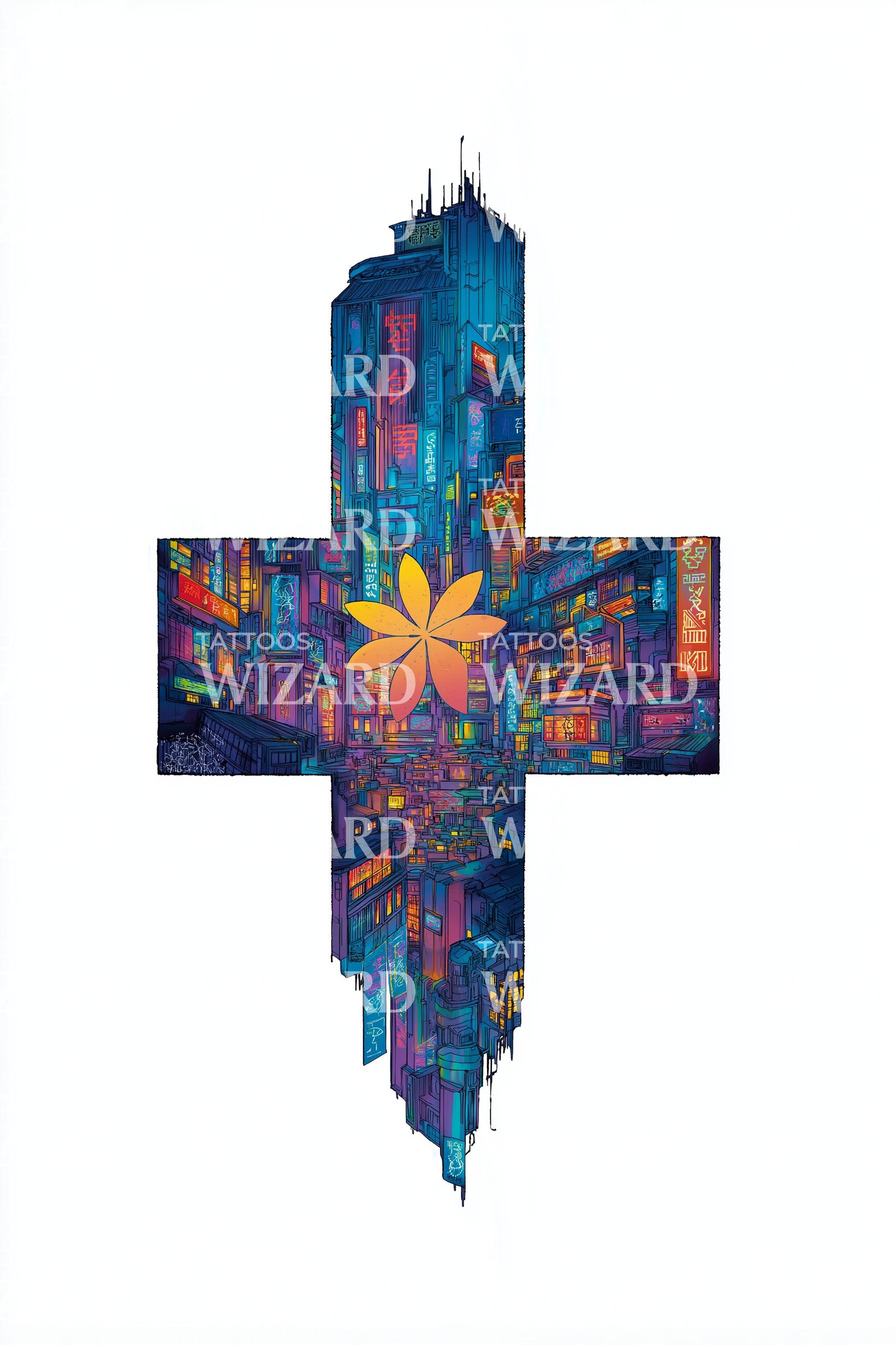 一款精美装饰性的纹身设计,巧妙地将信仰与装饰结合,以显著的十字架构成作品的核心。它完美地融入了充满活力色彩的花卉马赛克主题,呈现出色彩的艺术典范。非常适合那些希望以独特且富有艺术感的方式表达信仰的人。