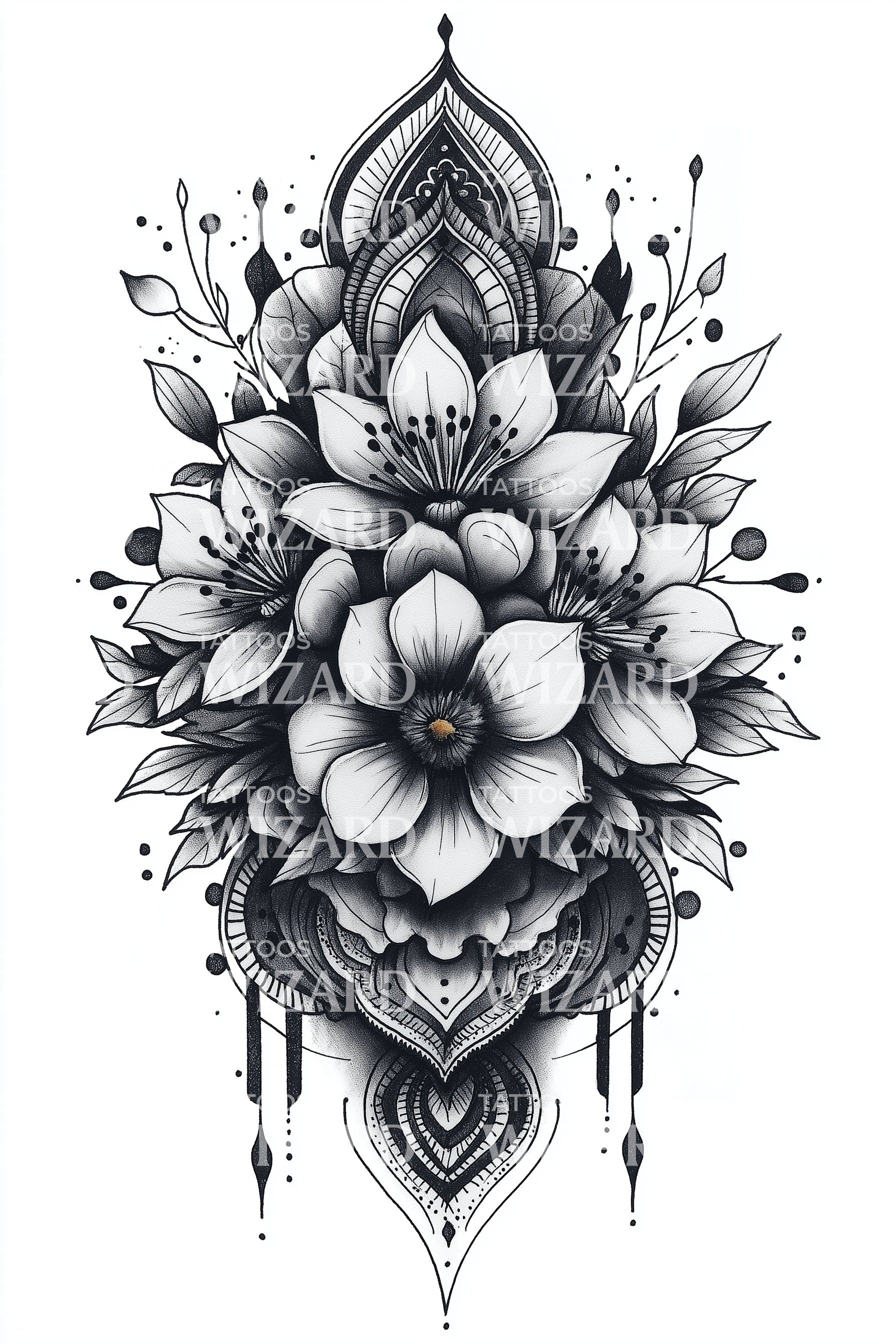 呈现一款优雅的黑灰色纹身设计,巧妙融合了几何图案。装饰性的美学与华丽的花卉元素及锋利的匕首图案完美交织,营造出美与力量的和谐融合。非常适合欣赏复杂且精致设计艺术品的您。