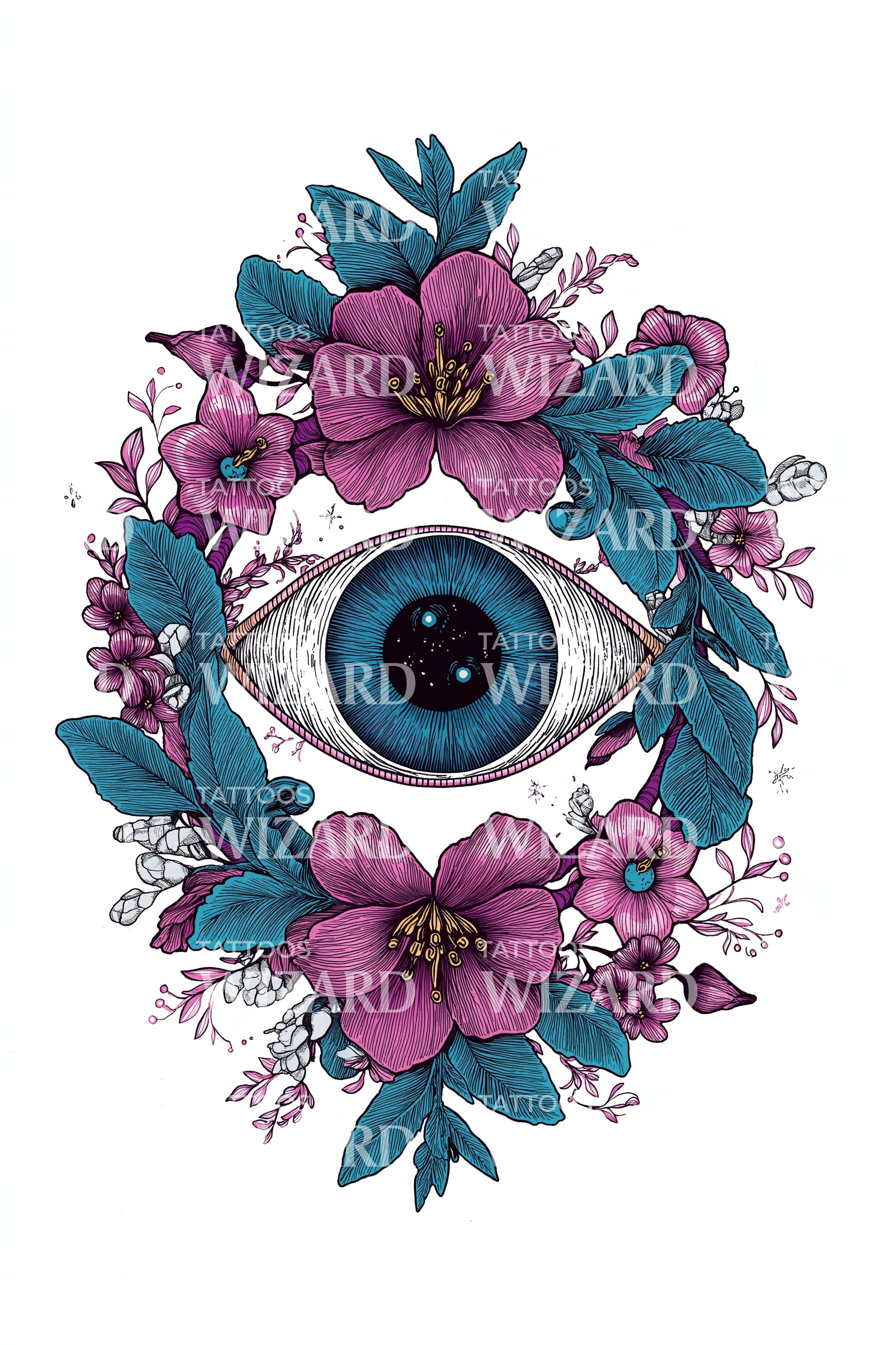 为您的肌肤增添一抹醒目的色彩,这款充满活力的插画风纹身设计将您的美丽愿景凝聚于一只迷人的眼睛中,细腻地环绕着盛开的花环。这个视力的象征和守护能量散发出大胆而富有感染力的美学。