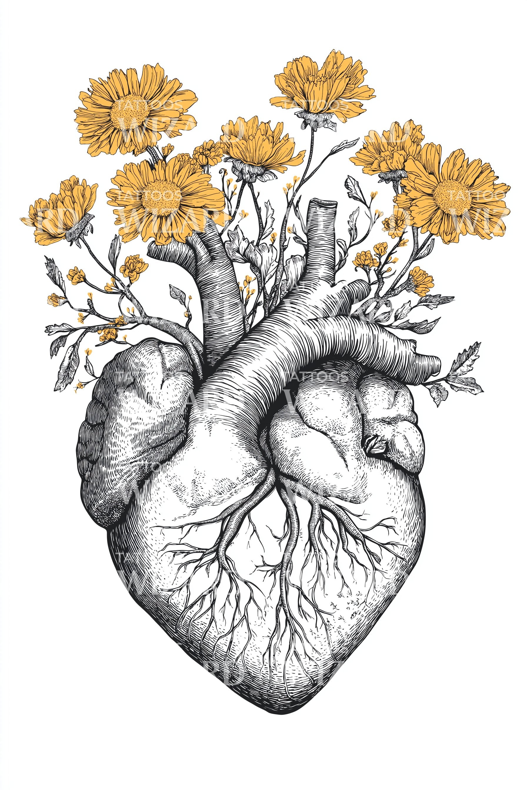 释放爱与自然的表达,这款精美的纹身设计将花卉图案融入解剖心脏,完美融合了绽放与生命力的感觉。沉浸于其迷人的象征意义中,花朵倾泻出生命,创造出绽放爱情的生动隐喻。