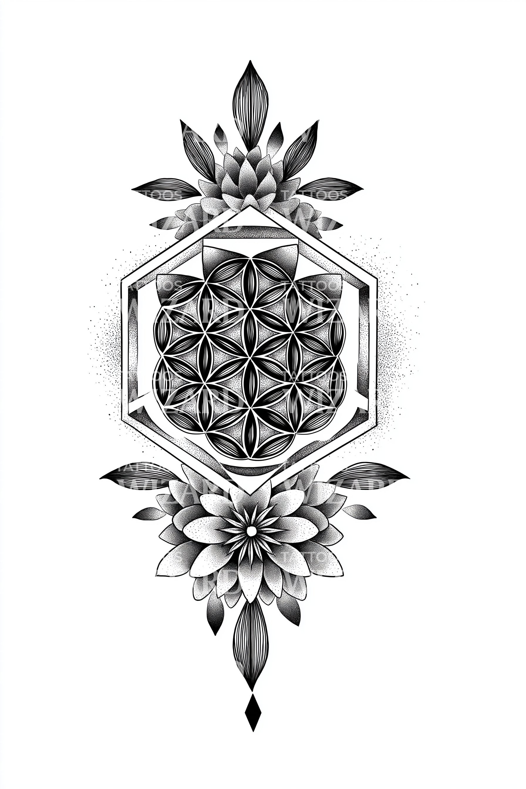 这款优雅的纹身设计巧妙融合了装饰性的花卉图案与六边形几何形状。设计本身的美感通过精细的金银丝工艺得以突出,增添了一层额外的精致感。对于欣赏身体艺术中优雅美学的人来说,这是一个令人惊艳的选择。