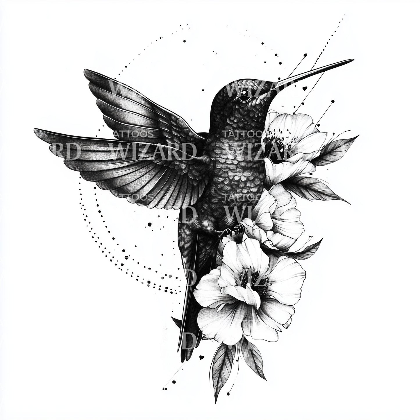 沉浸在这款黑灰色纹身设计的精致现实主义中,设计中有一只精致的蜂鸟和细致的花朵。这个设计完美地捕捉了自然的本质,达到了美与韧性的详细表现,非常适合表达你独特的精神。