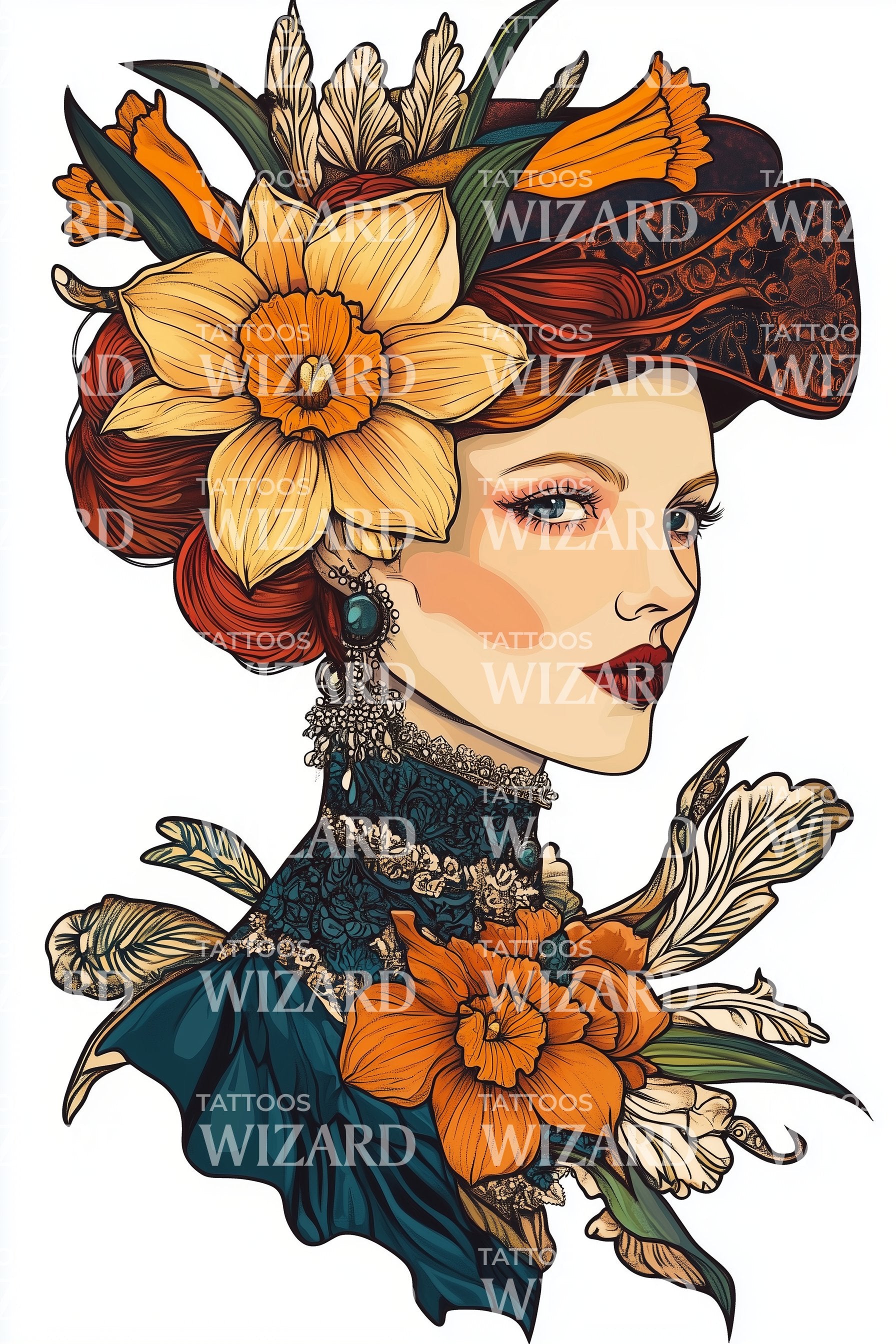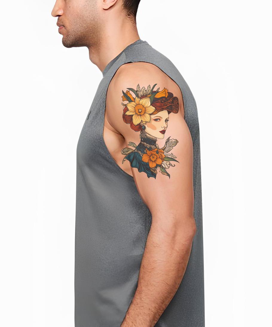 深入探索这款新传统纹身设计,描绘了一位优雅复古的女士肖像,佩戴着别致的帽子和花卉装饰。精美复杂的设计展现了怀旧魅力与现代精致的融合,成为任何纹身爱好者的永恒之作。