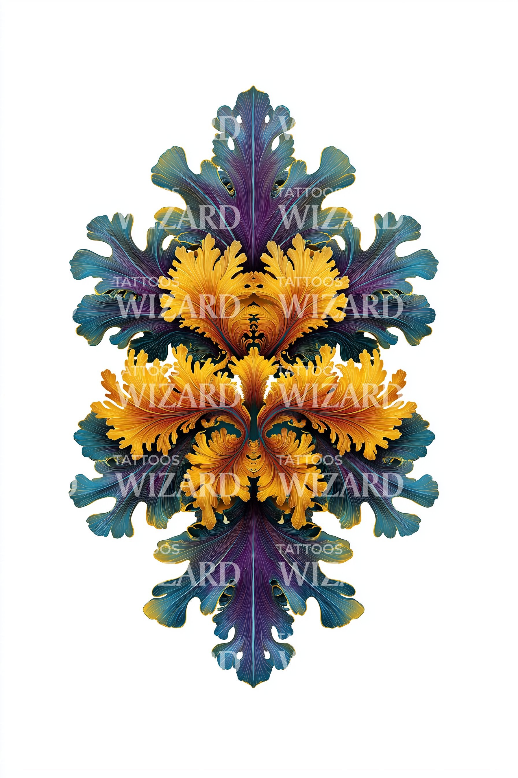 沉浸于这款花卉曼陀罗纹身设计的精致之美。其华丽的美学、对称的和谐以及鲜艳的色彩图案,不仅将吸引你的目光,更将触动你的心灵。作为艺术与精神的鲜明体现,完美适合欣赏深邃美感的你。