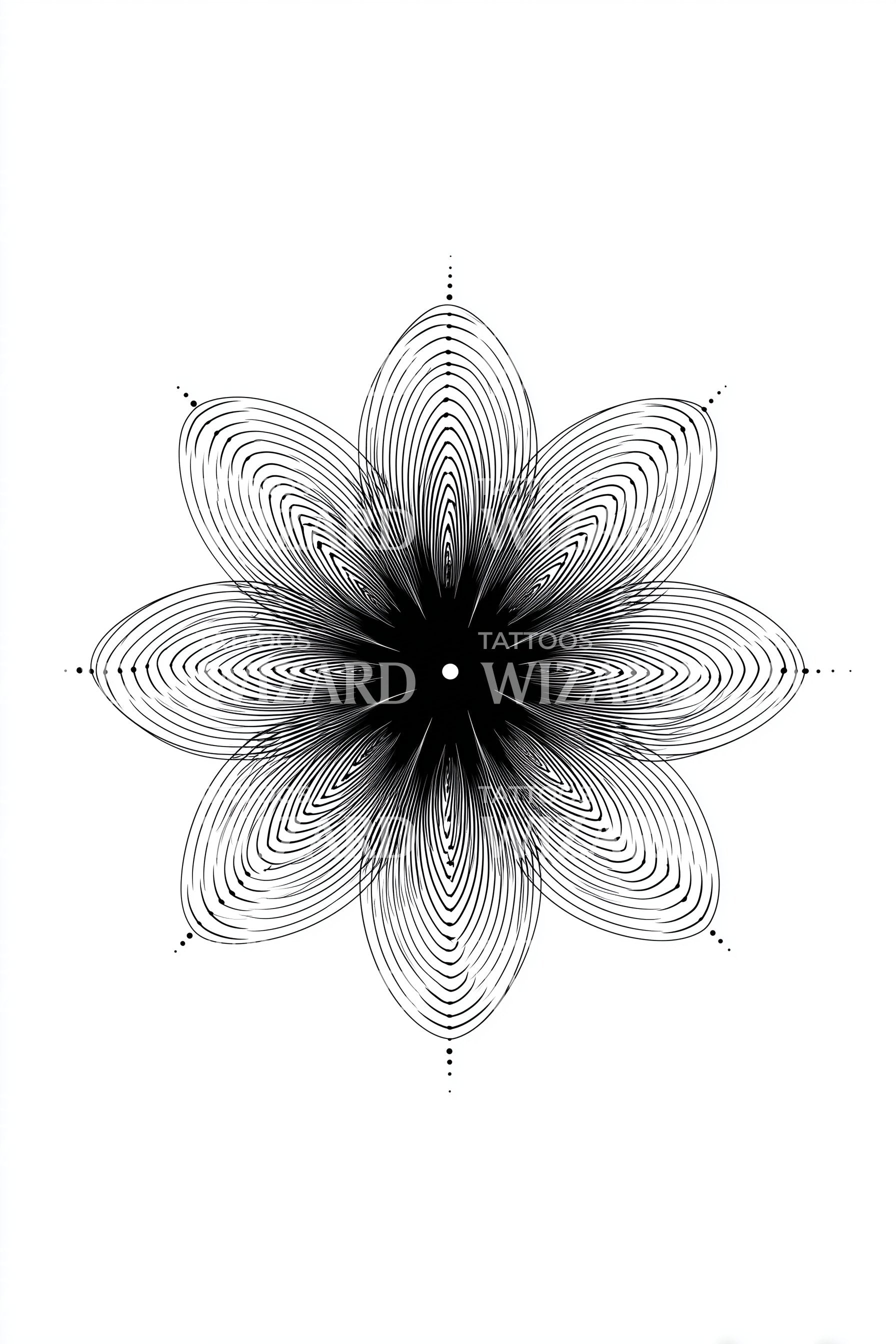 Radiant mandala flower rings outward in lace-like concentric petals, tapering to dotted accents. A luminous core symbolizes focus; layered petals echo growth, protection, renewal. Wearing it feels centered, elegant, powerful. Ideal on sternum for symmetry, upper back for haloed presence, forearm for flowing length, thigh for soft curvature.