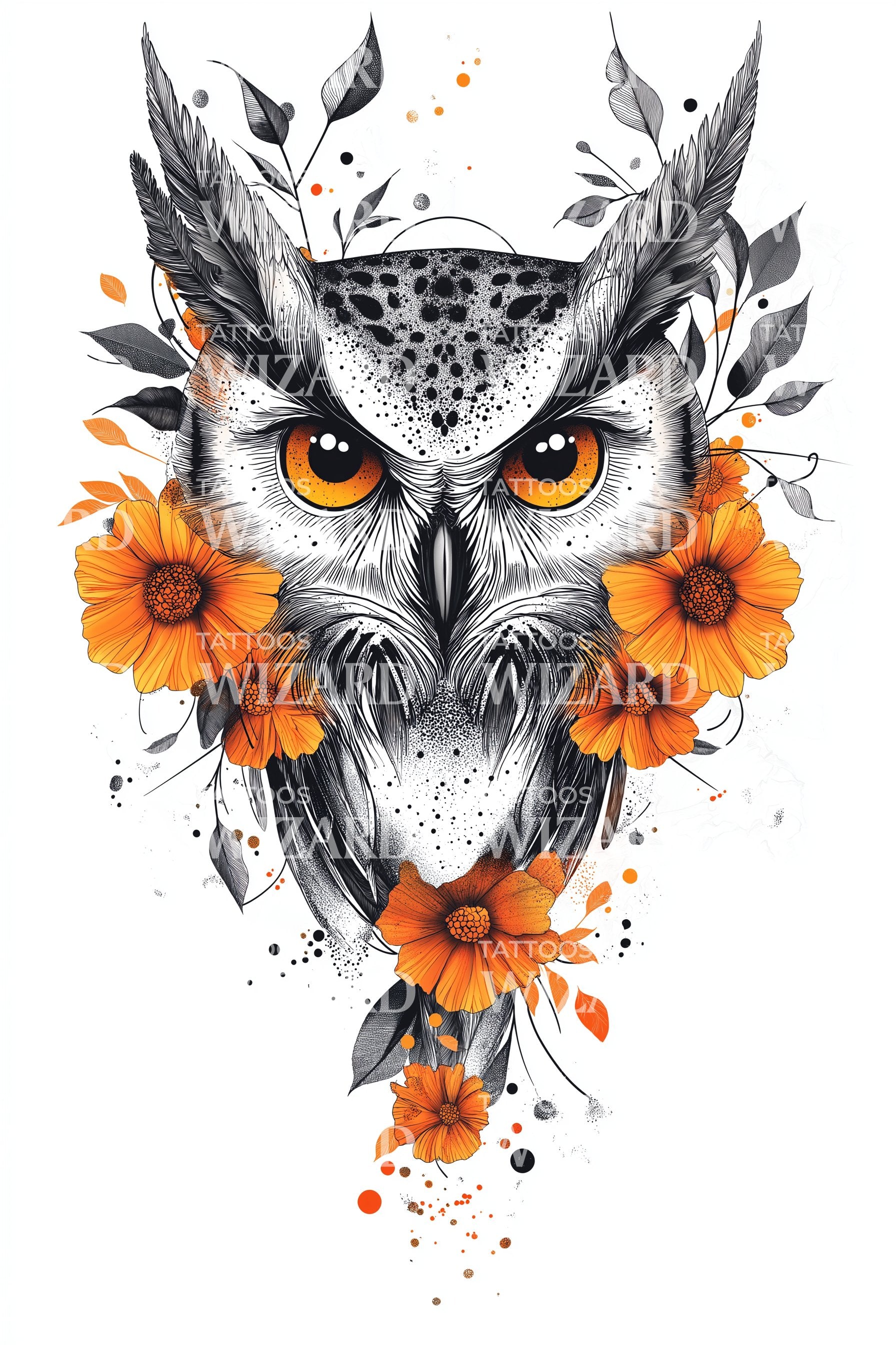花卉猫头鹰凝视纹身设计