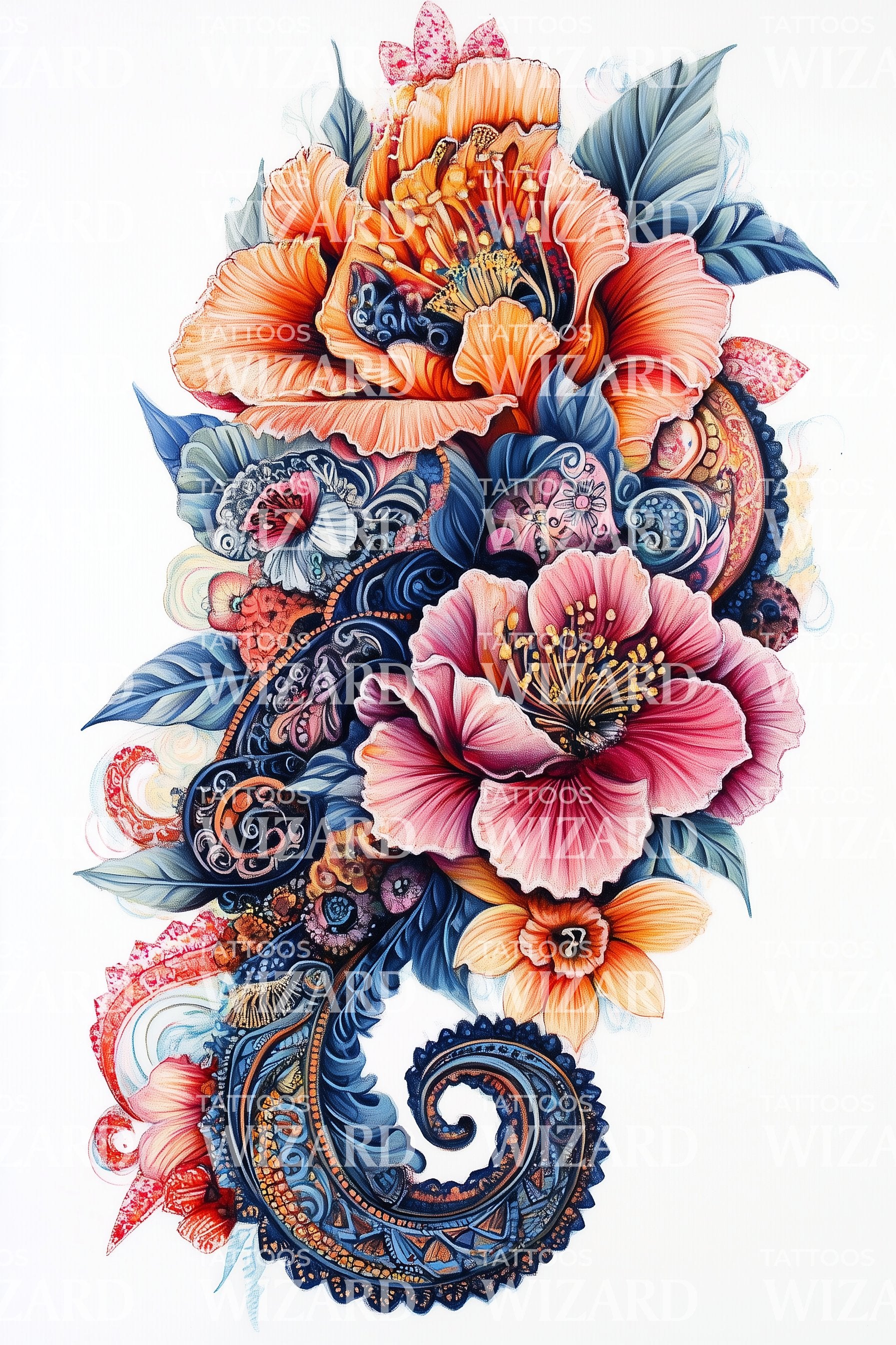 体验这款精致设计的新传统海马纹身,感受大海的壮丽。绽放着鲜艳华丽的花卉元素和醒目的海洋色彩,这款设计完美融合了优雅与锋芒。用风格纹身,彰显大胆个性。