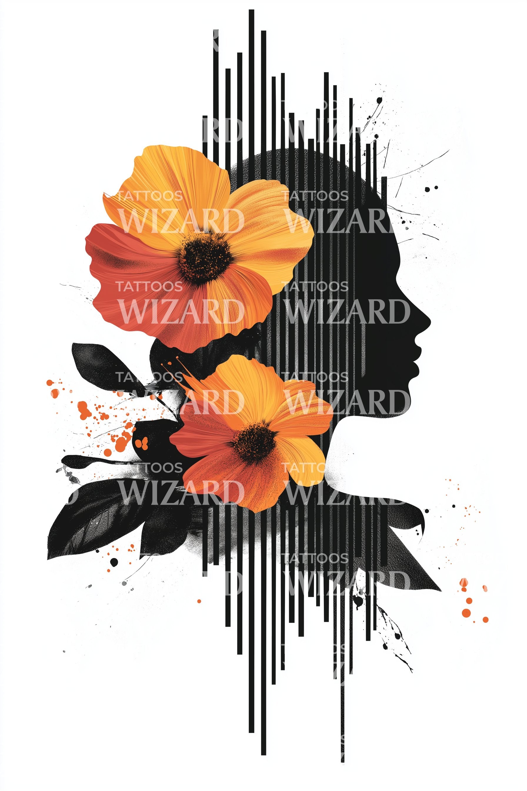 这款插画风格的纹身设计优雅地体现了女性魅力。它以一位女性侧影的醒目轮廓为特色,与精致的花卉图案形成美丽的对比。巧妙融合的深色阴影与轻盈的花卉图案,将你的肌肤转化为神秘对比的画布。