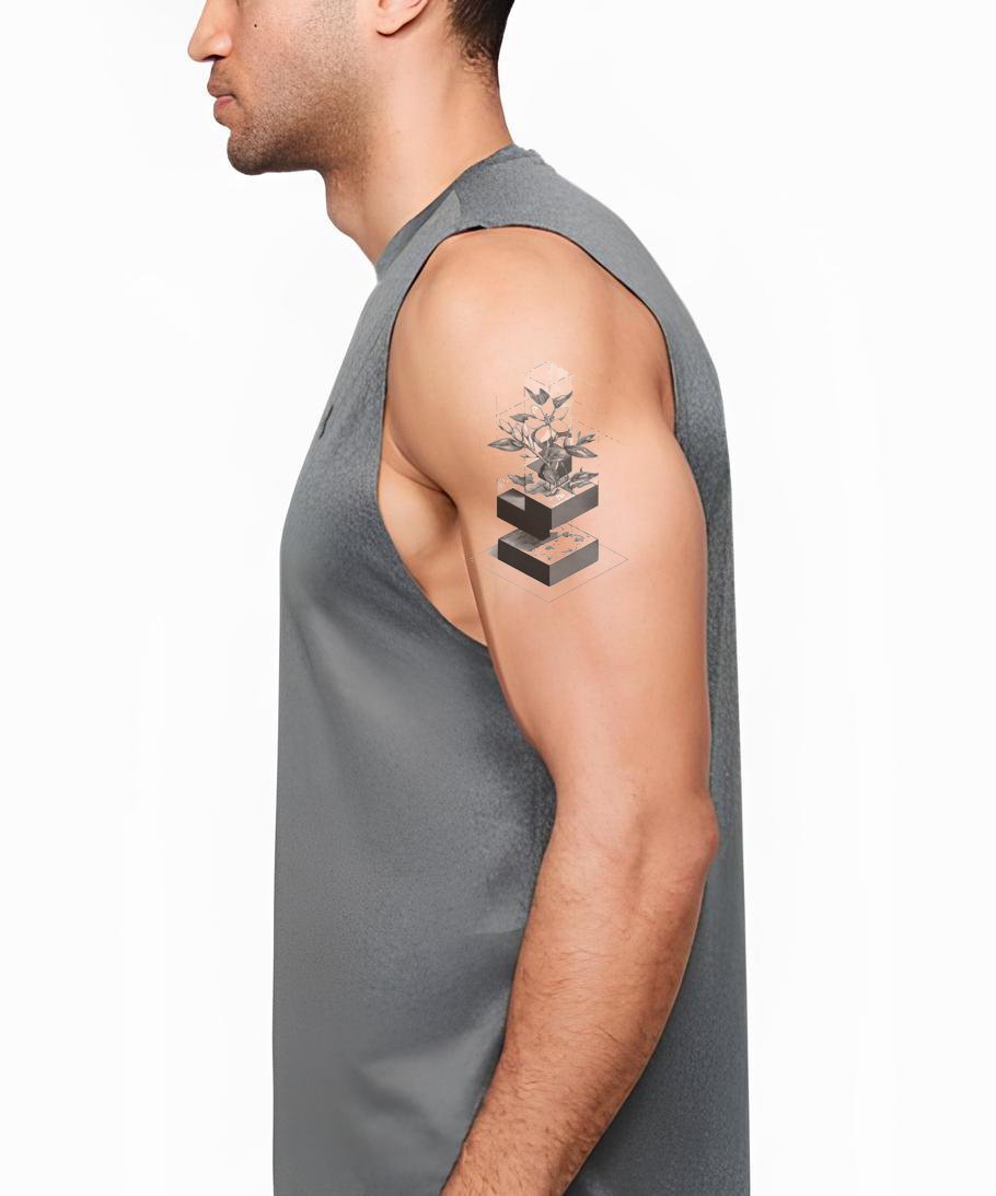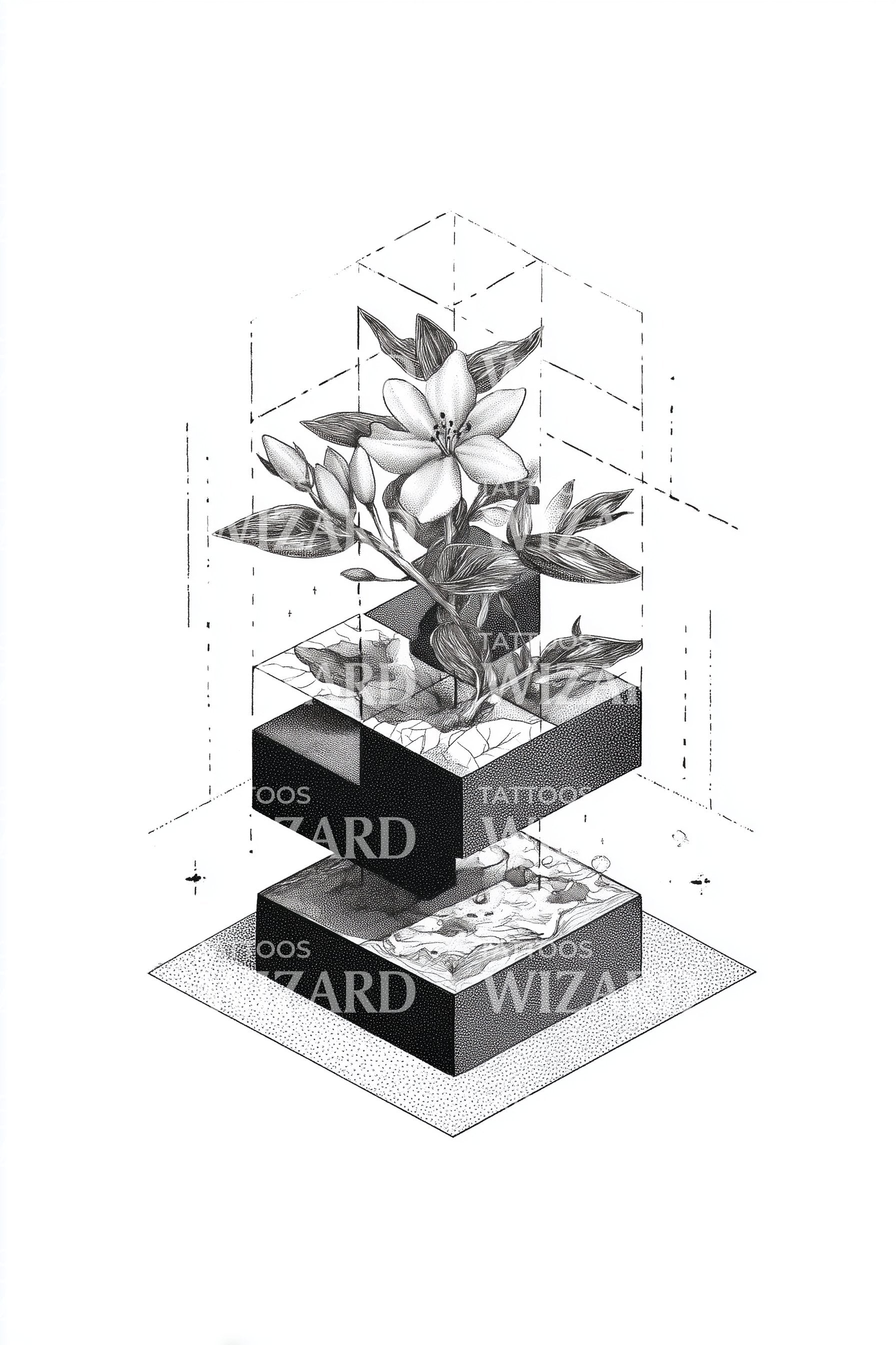 体验自然之美与数学精确的融合,这款单色几何纹身设计巧妙地结合了百合花图案与立方体结构,营造出一步步花瓣般引人入胜的视觉旅程。是将对称之美与花卉魅力优雅展现在肌肤上的理想选择。
