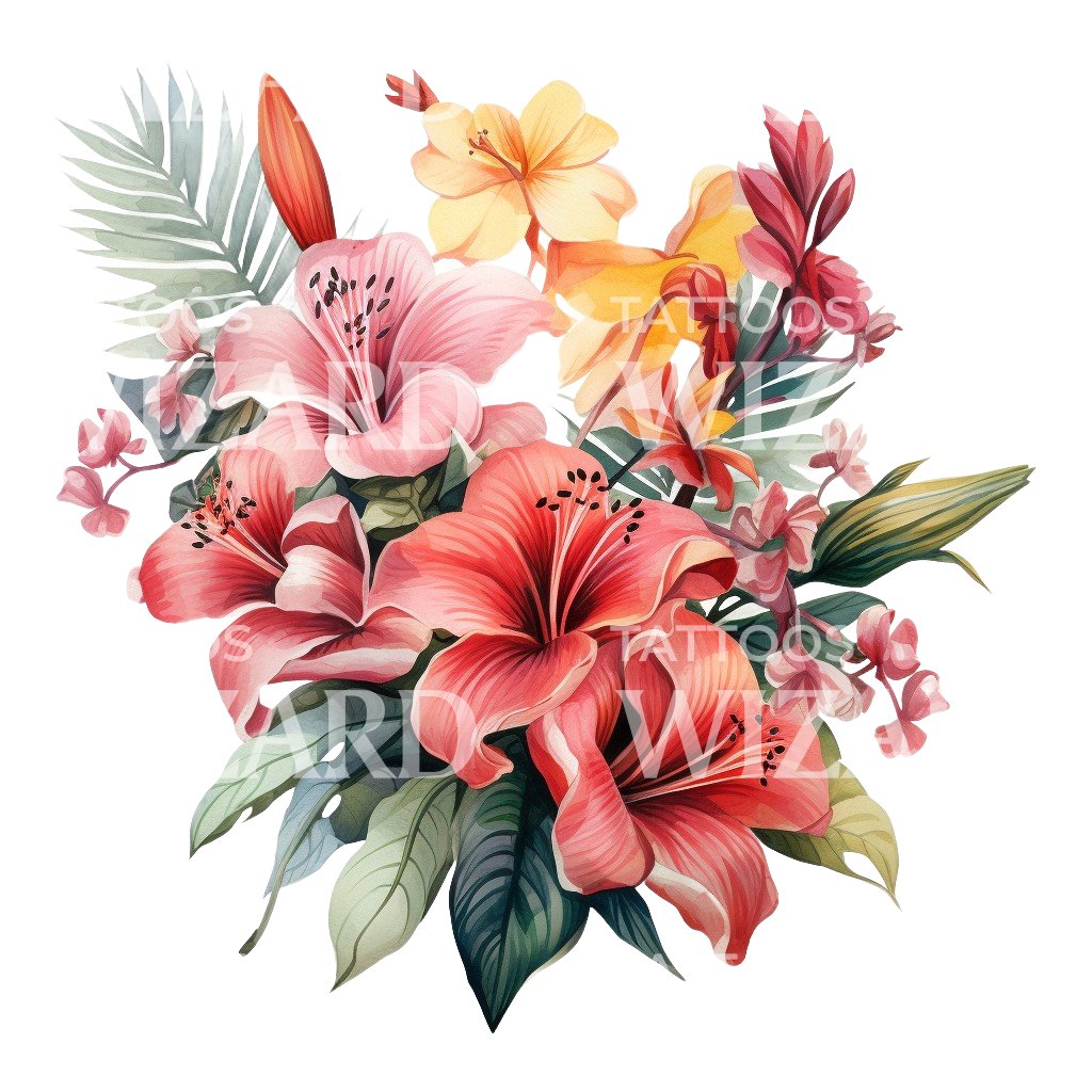 沉浸在我们花卉木槿纹身设计的热带花卉中。这个作品充满活力,细致的红色木槿与郁郁葱葱的热带植物交织在一起。它的花卉象征提供了引人注目的热情风格,旨在唤起你肌肤上的永恒夏日。非常适合热爱鲜艳和热带美学的人。