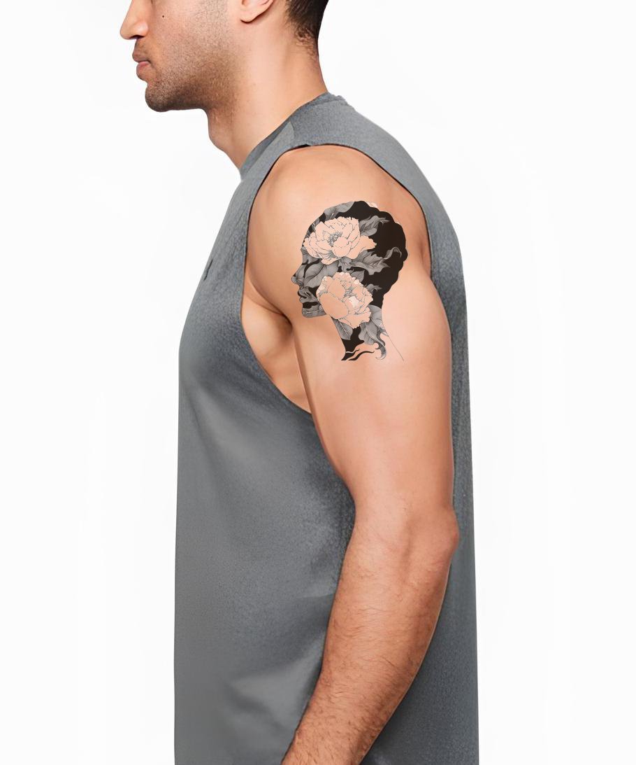 沉浸在我们现代女性头部纹身设计的美丽中。通过复杂的黑灰色花卉图案强调记忆,这些图案与大脑交织在一起,这件原创作品无缝地将优雅与内省结合在一起。这个设计是表达个性和珍惜记忆的真正创意方式。