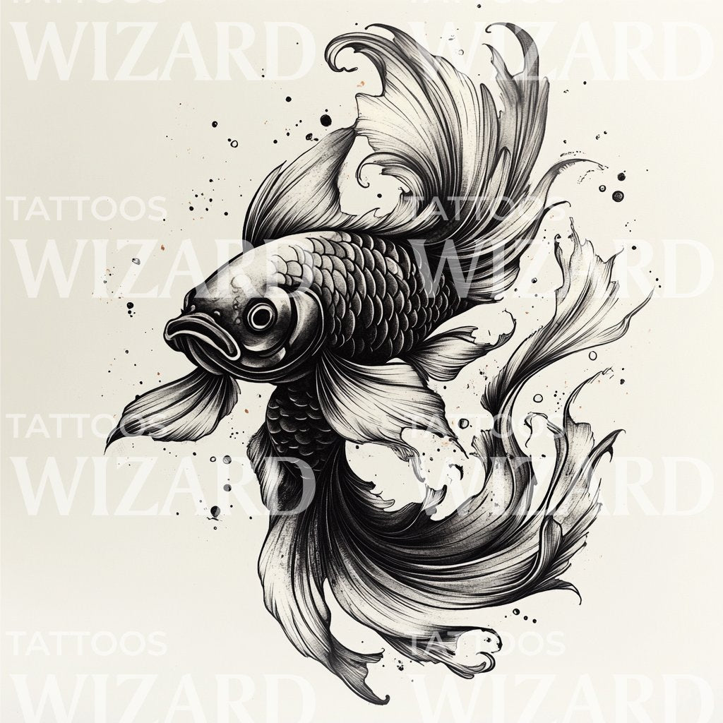 体验优雅与优雅,这款细线鱼纹身设计展示了复杂的线条,描绘流动的水、流畅的鳍和精美细致的鱼,全部浸没在深黑色的色调中。这个设计体现了迷人的美学,完美表达你对水中优雅的热爱。