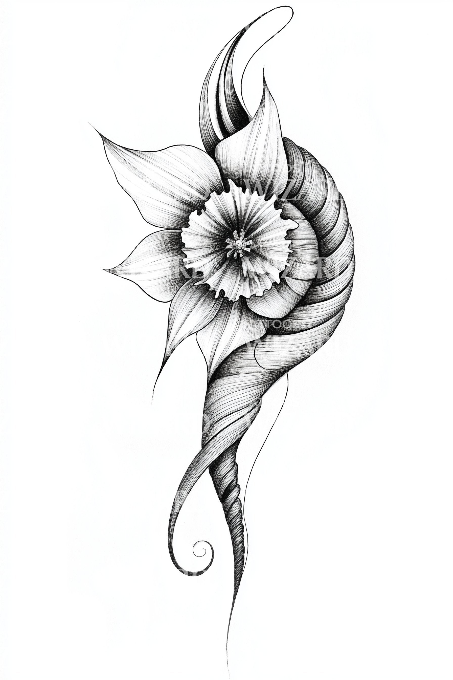 沉浸于这款素描纹身设计的优雅艺术之中。它完美地捕捉了盛开水仙花与飘逸丝带交织的优雅。精湛的线条勾勒出花朵的柔美曲线与细腻质感,象征着纯粹的优雅与魅力。