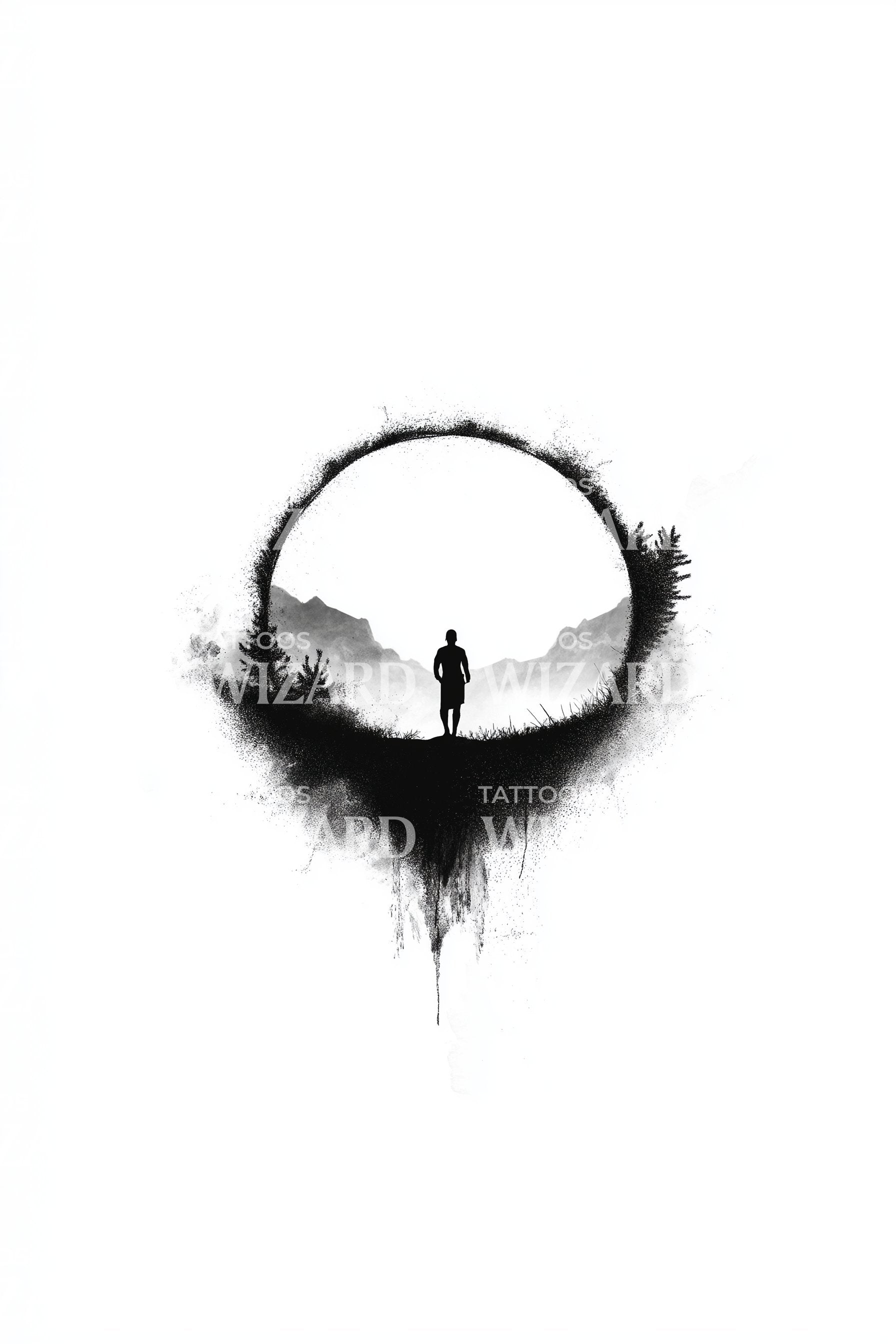 踏入另一个境界,这款点描纹身设计展现了一个神秘的门户,由环形森林环绕。此艺术作品完美融合了自然与幻想,象征着独特的逃离与尘世与神秘之间的联系,是你冒险精神的理想写照。