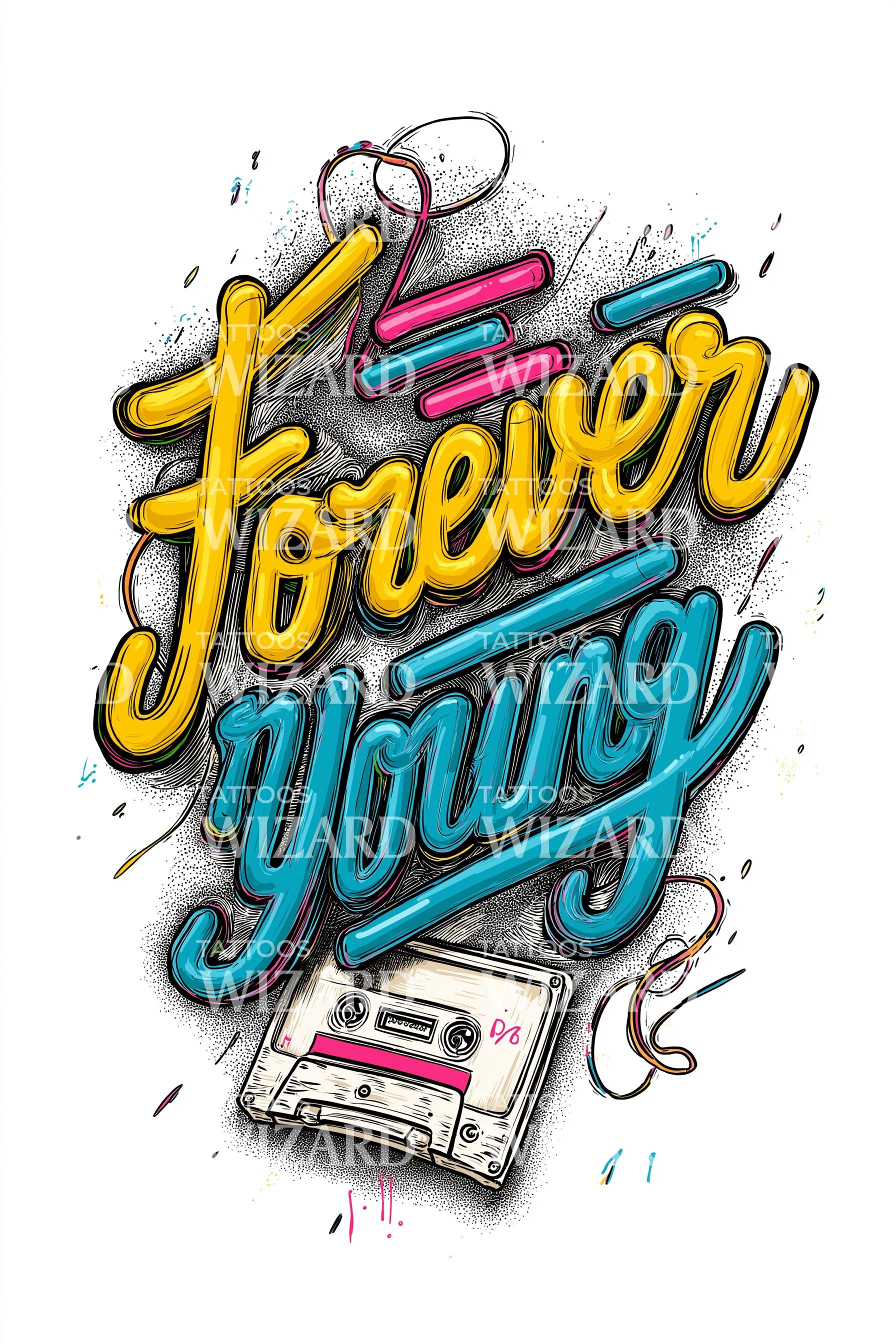Neon-slick newschool lettering pops in gold and aqua, splashed with magenta, spiraling tape around a retro cassette. A vow to stay forever young, soundtracked by mixtape memories. Feels like summer air and nights. Ideal placements: forearm or calf for vertical flow, ribcage or outer thigh for sweeping script.