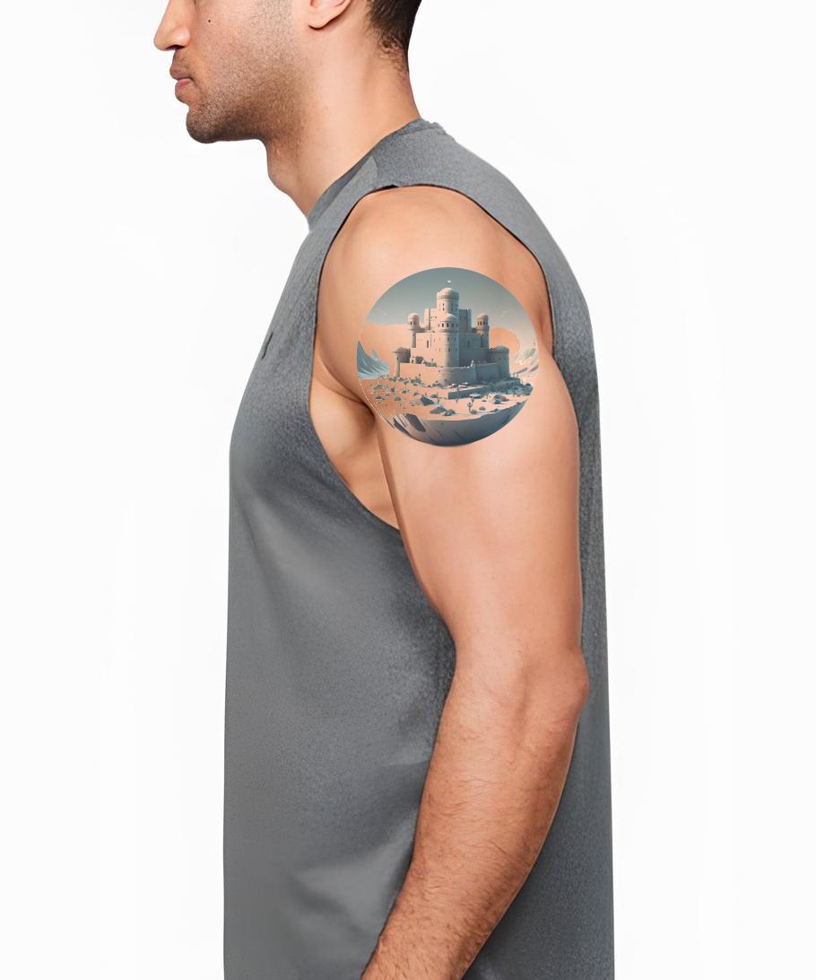 沉浸在未被诉说的故事的壮丽中,这款插图纹身设计展示了一座巍峨的堡垒,雄伟地矗立在一个高贵的王国中,象征着国王的坚定统治。设计精致细腻,它将你的肌肤变成一个迷人的皇家堡垒故事画布。