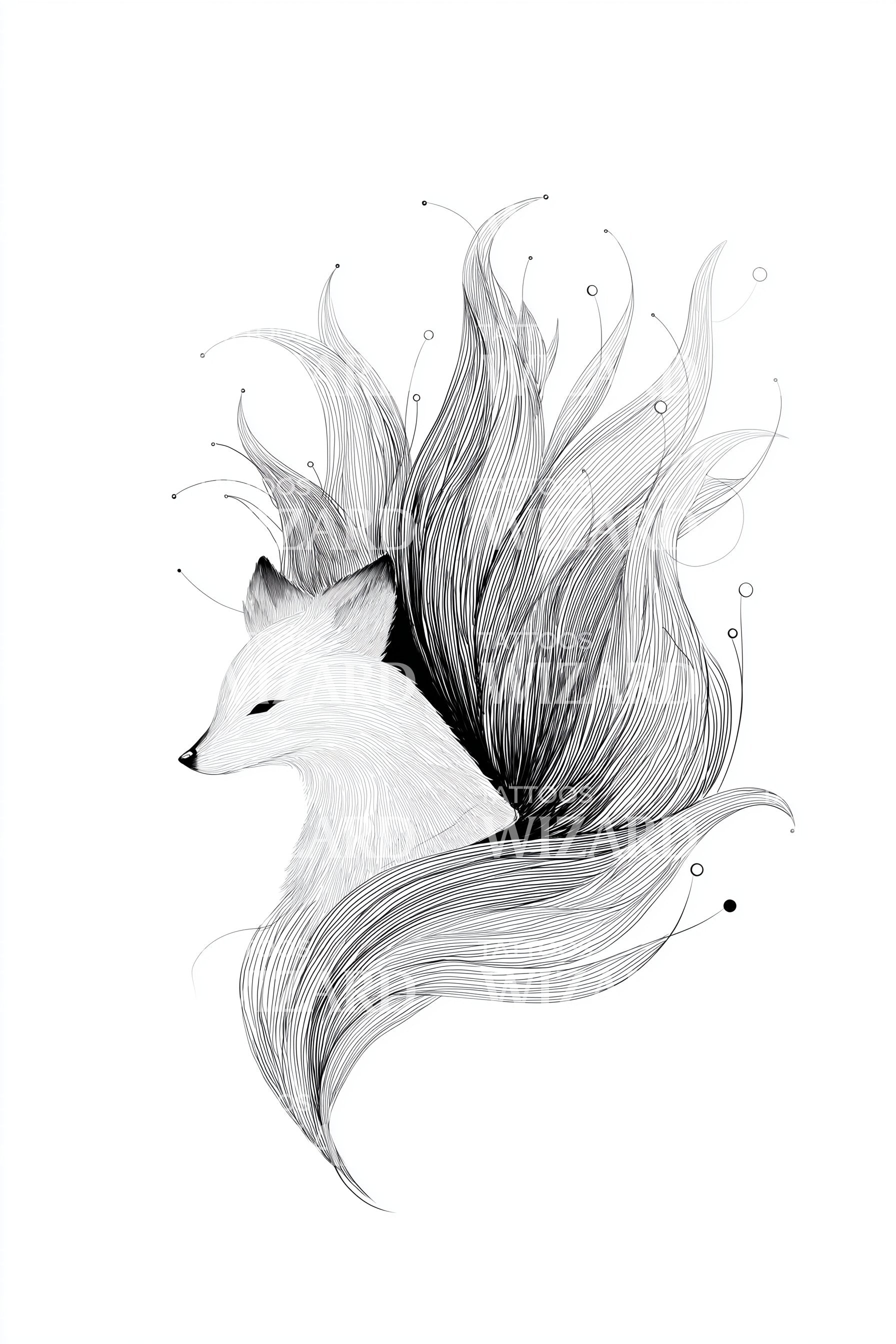 一幅宁静狐狸的插画肖像,细腻的毛发如风般展开,点缀着轻盈的光点。象征着聪慧的优雅与守护的灵魂在流动。佩戴它如同拥有静谧的力量与清晰的专注。非常适合前臂展现优雅的流动感,肋骨处呈现潮汐般的扫动,小腿展现垂直滑翔,脊柱则如上升的羽 plume。