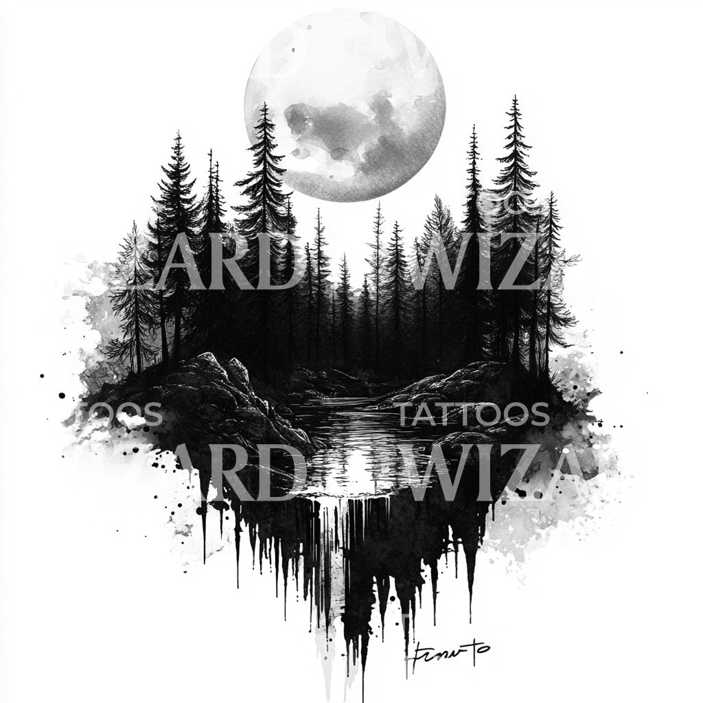 释放你神秘的一面,选择这个水彩纹身设计。它展现了在迷人月光下的黑暗森林。走在隐秘夜晚的小径上,拥抱这个设计所蕴含的神秘气息。它是未知的象征,以及它所揭示的刺激。