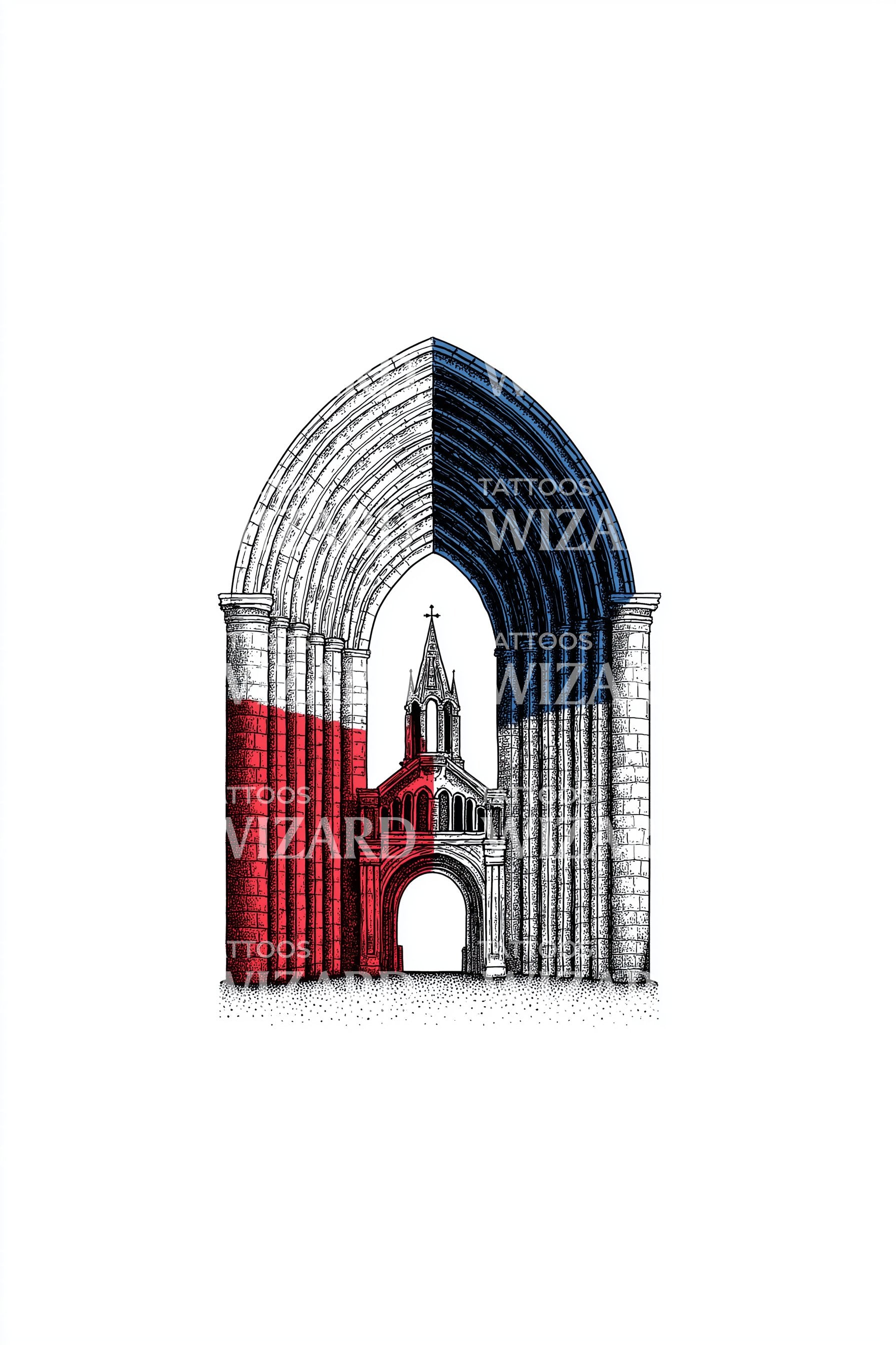 作为对法国的生动致敬,这款设计以一座高耸的哥特式大教堂为主体,置于一座宽阔的拱门之下,点缀着细腻的三色旗图案。清晰的线条和质感阴影仿佛石材与彩色玻璃,彰显遗产、信仰与建筑,成为热爱历史与自豪根源的永恒象征。