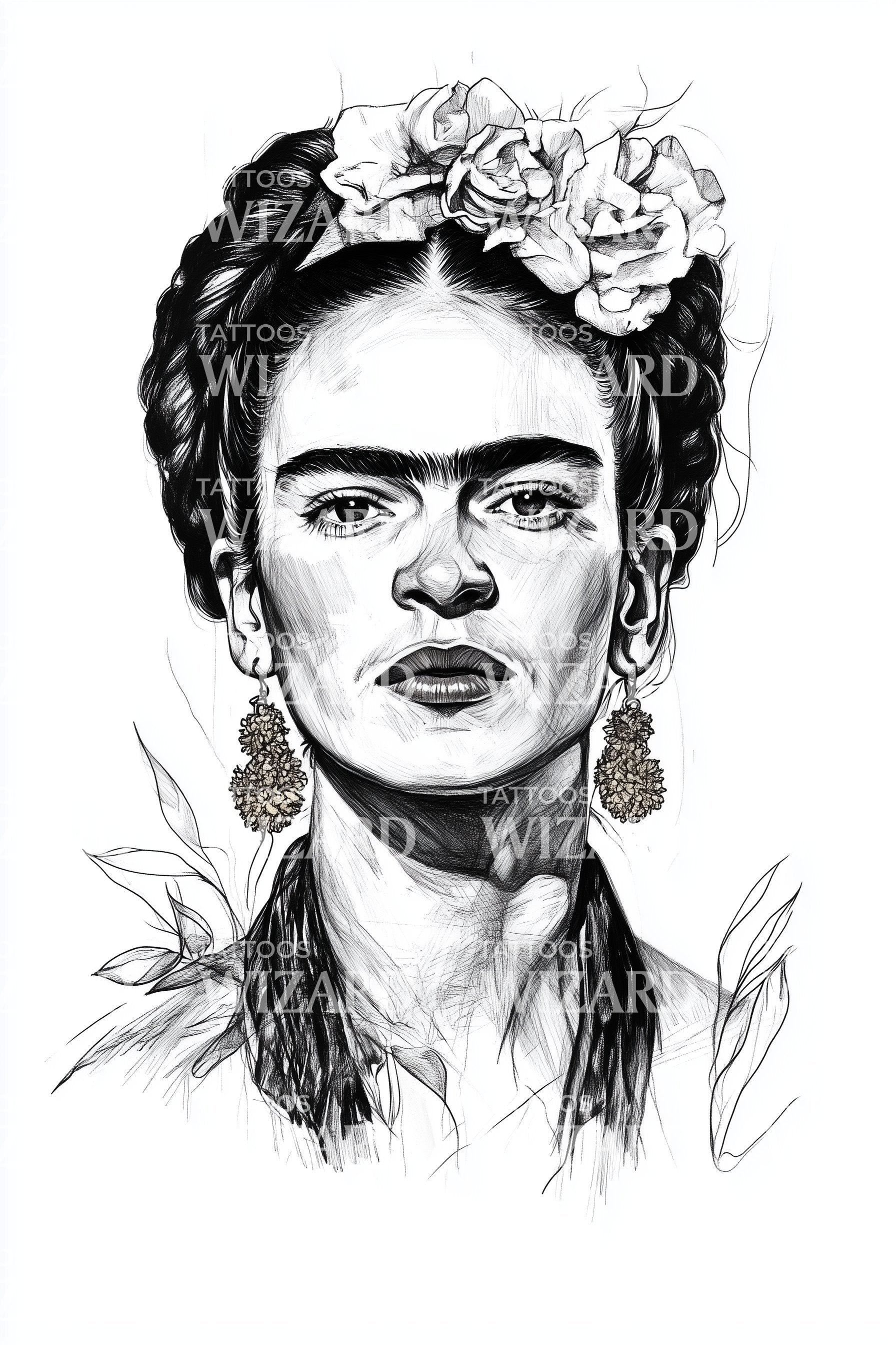 拥抱女性主义的标志性力量,这款黑灰色弗里达·卡洛纹身设计。通过逼真的花卉元素加以增强,展现了这位传奇人物持久的力量和独特的美。非常适合那些希望以单色调墨水刻画坚韧与不懈积极象征的人。
