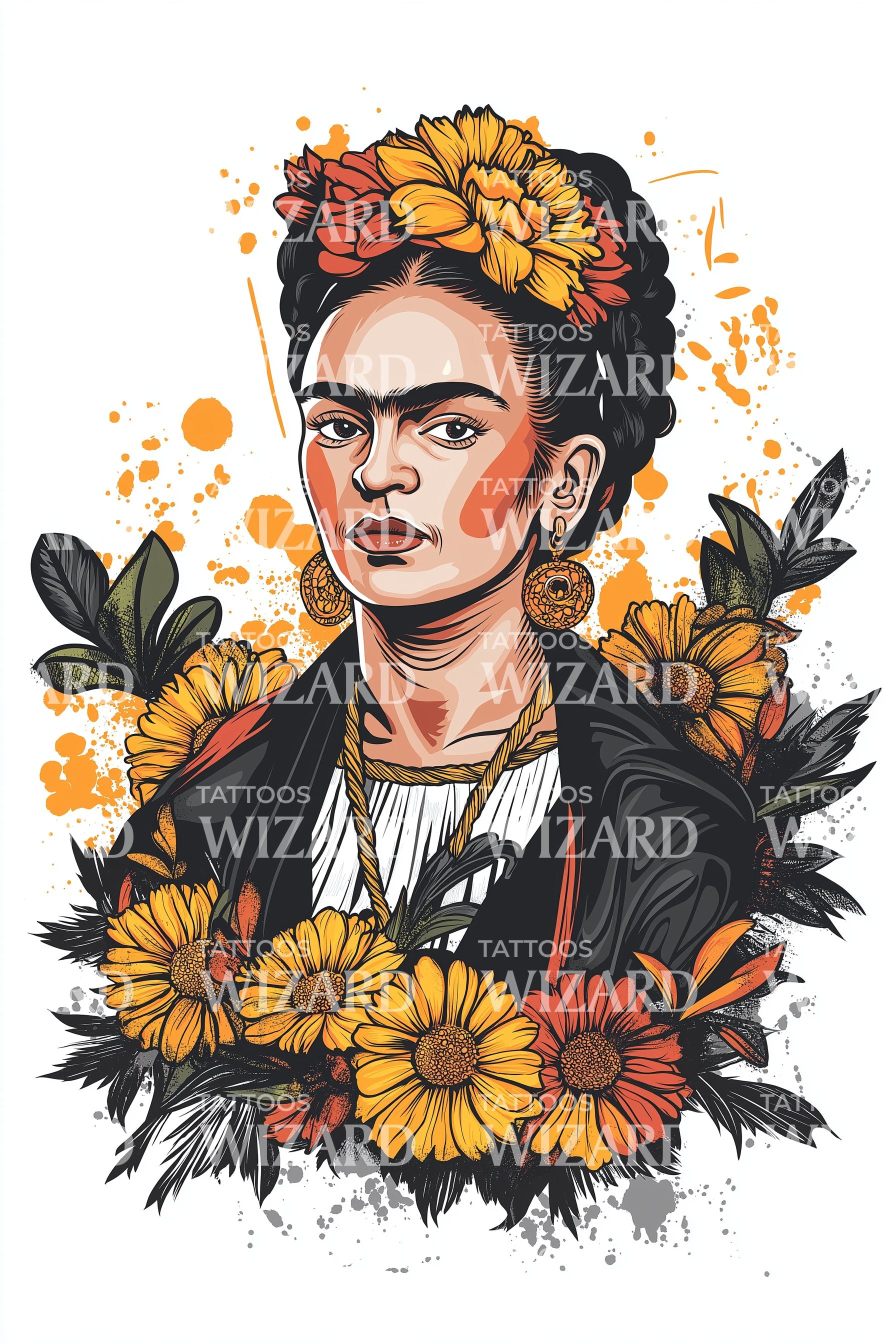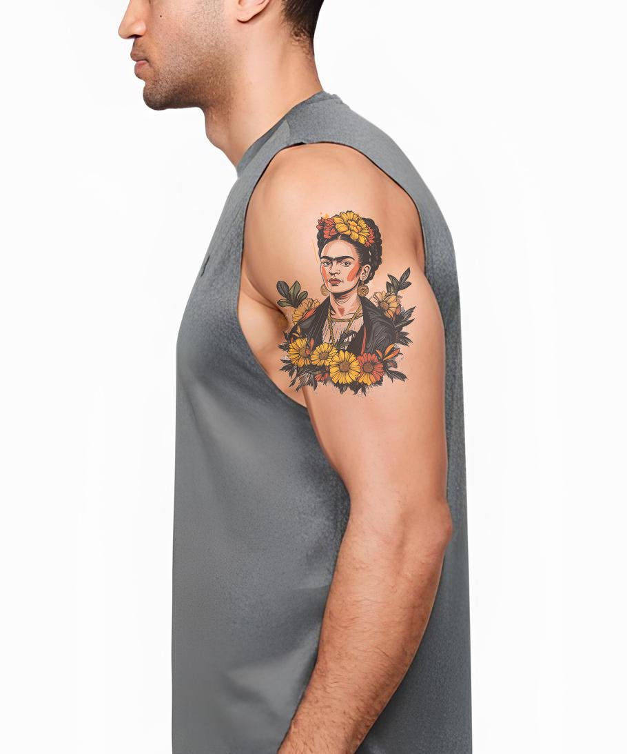 沉浸于充满活力的新传统美学,这款受弗里达启发的纹身设计。色彩斑斓的花卉细节丰富,充分展现了标志性的艺术风格。作为对创造力和个性的致敬,这件作品超越了纹身艺术,带来既迷人又富有想象力的视觉体验。