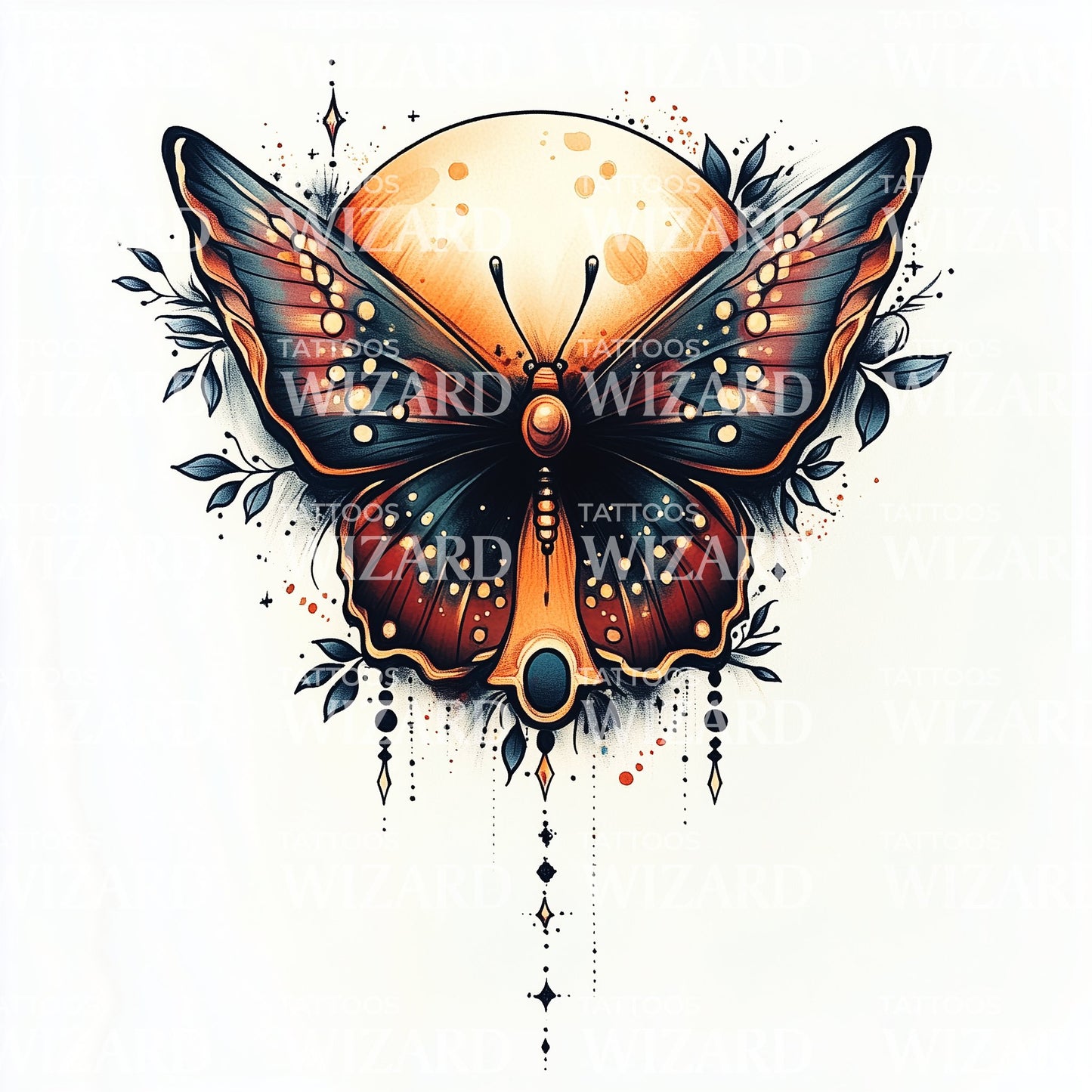 探索大自然夜晚之美的魔力,尽在我们的新传统蝴蝶月亮纹身。这个设计展示了月球宇宙魅力与惊艳夜蝴蝶的生动融合,捕捉了满月之夜的迷人神秘。为你的肌肤增添一抹自然艺术的色彩!