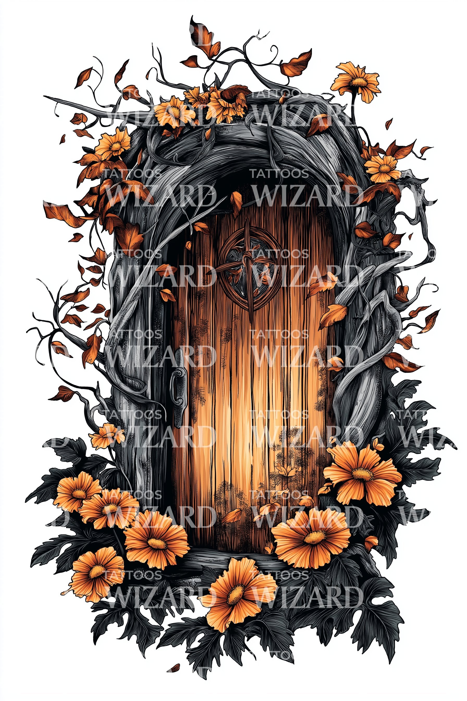 沉浸于这款独特纹身设计的神秘之中,展现了一扇隐藏在幽暗茂密花园中的神秘木门。设计中精致的花卉插画更添魅力,暗示着门后隐藏的未曾诉说的秘密。这是奇幻与自然的迷人融合,真正向超现实致敬。