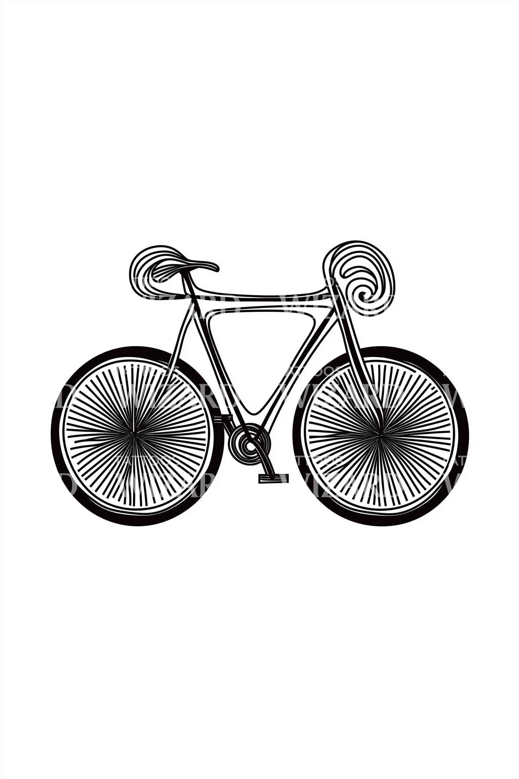 Hand-sketched bicycle in crisp black lines, spiral bars and starburst spokes forming elegant mechanical geometry. Gears mark steady effort, wheels radiate momentum, celebrating cycling’s ritual and the endless ride. Wears like freedom and focus. Ideal on forearm for flow, calf for climb, ribs for sweep, upper back for symmetry.