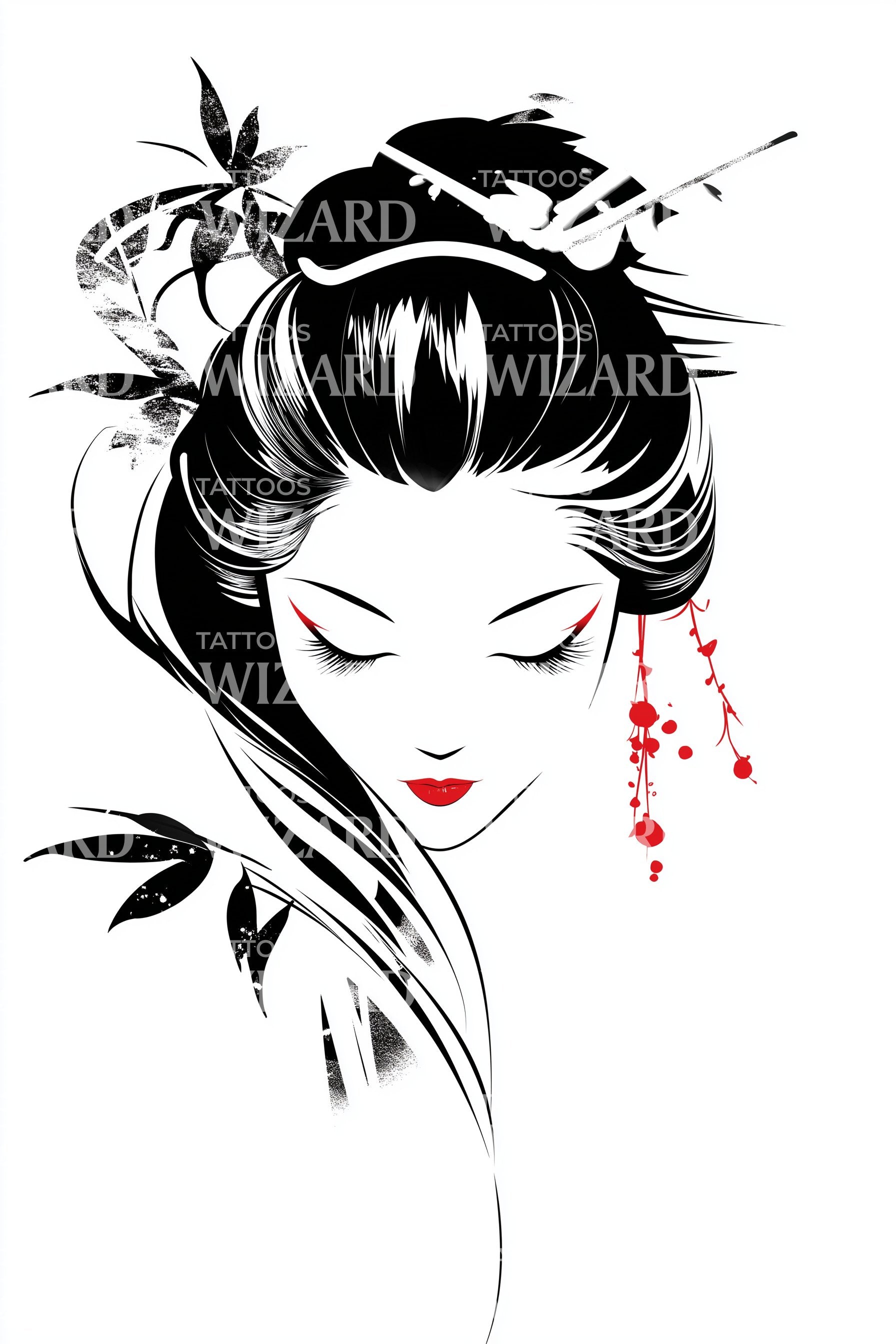 Ink-poised geisha portrait, black and white grace with vermilion lips and blossom drops, hairpins nested, bamboo whispers, fan curve implied. Symbol of classic beauty, strength, and fleeting spring. Wearing it feels serene and magnetic. Ideal placements: forearm for arc; ribcage for vertical flow; shoulder for reveal; calf for tapering sweep.