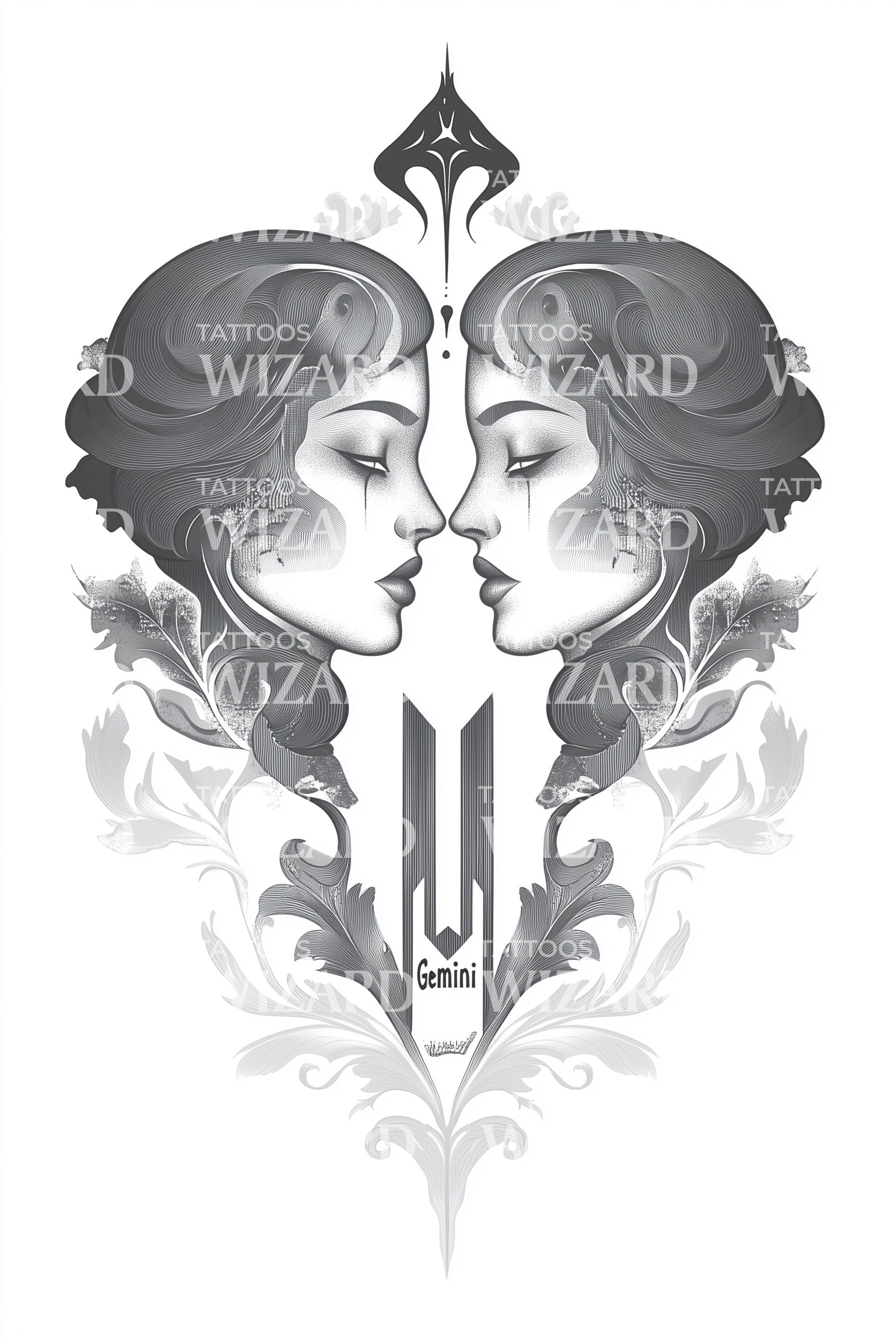 Fineline twins face each other in mirrored grace, hair carved with delicate currents and framed by airy botanical scrolls. Symmetry honors the Gemini zodiac’s dual wisdom, the breath between voices, the meeting of mind and reflection. Wearing it feels like balance in motion, lightness, curiosity, and beautifully held contradictions.