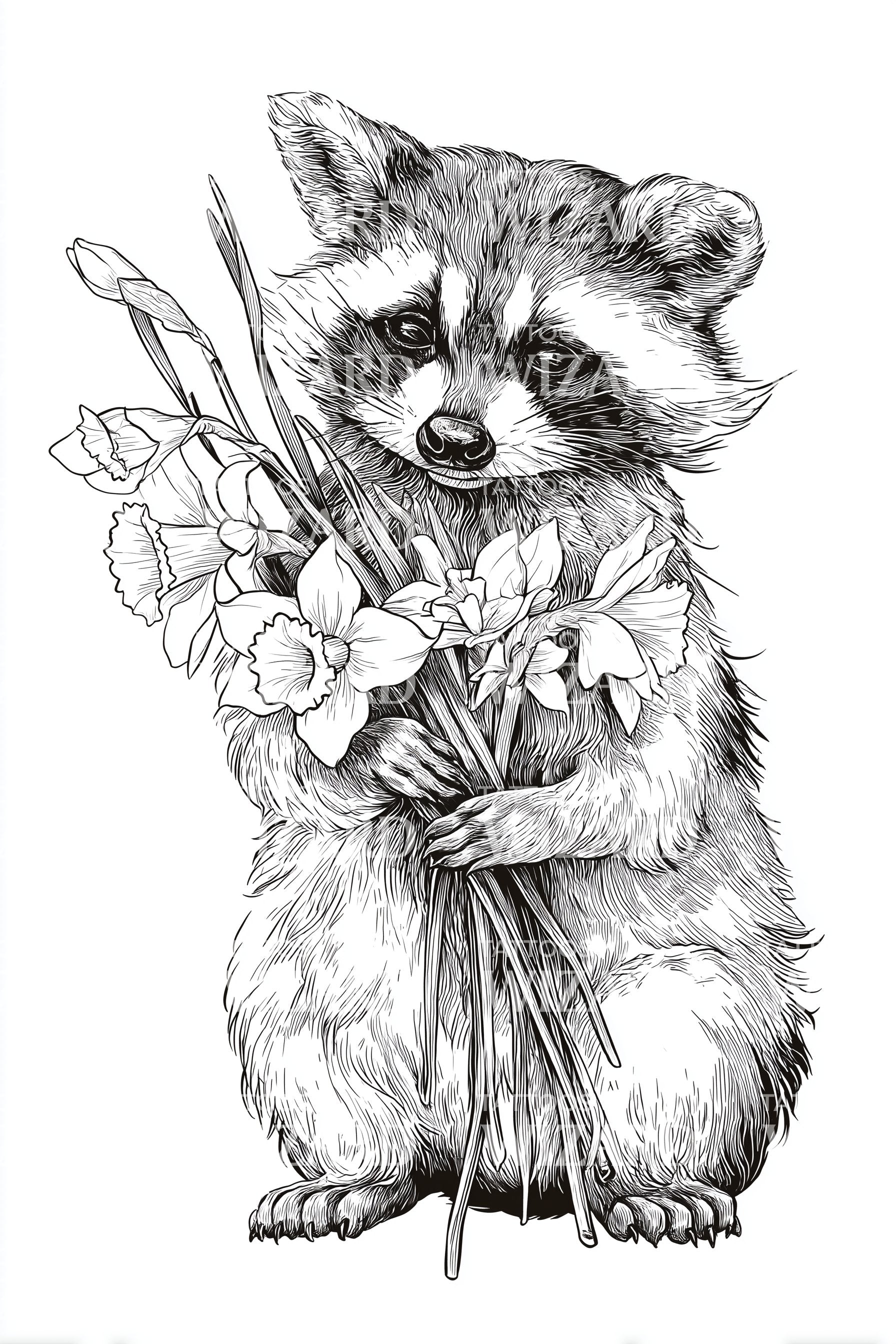 拥抱你温柔的本性,这款插画风浣熊纹身设计以柔和的线条勾勒,点缀着精致的花朵,诗意地描绘了这位深受喜爱的森林生物,呈现出奇幻与美感的独特融合。非常适合寻求独特纹身灵感的动物爱好者。