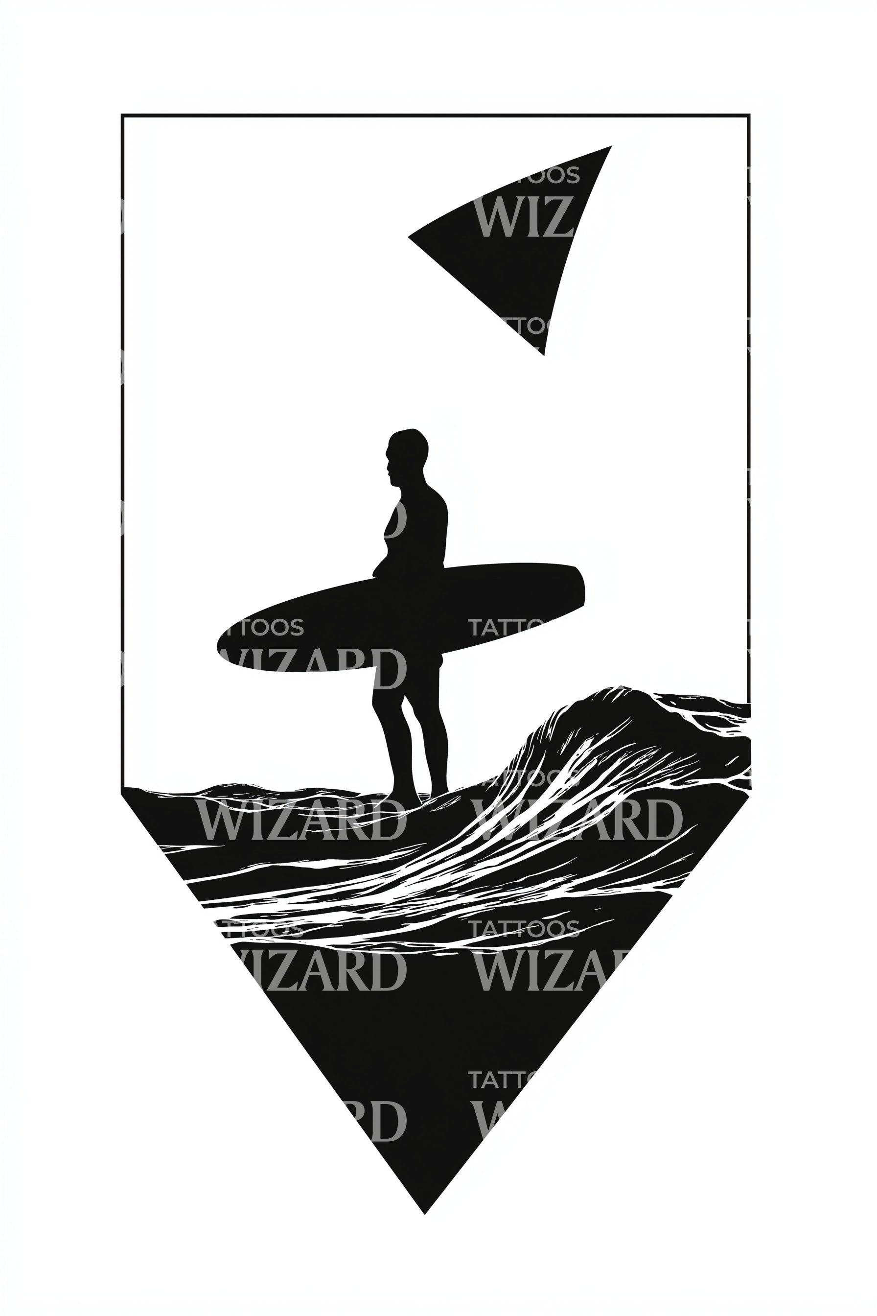Bold black geometry frames a lone surfer, standing poised above a cresting sea within a sharp, shield-like point. Clean lines carve foaming waves; a floating triangle marks direction and wind. Symbolizing courage, rhythm, and return to self, this piece inspires calm readiness, salt-lit focus, and quiet grit.