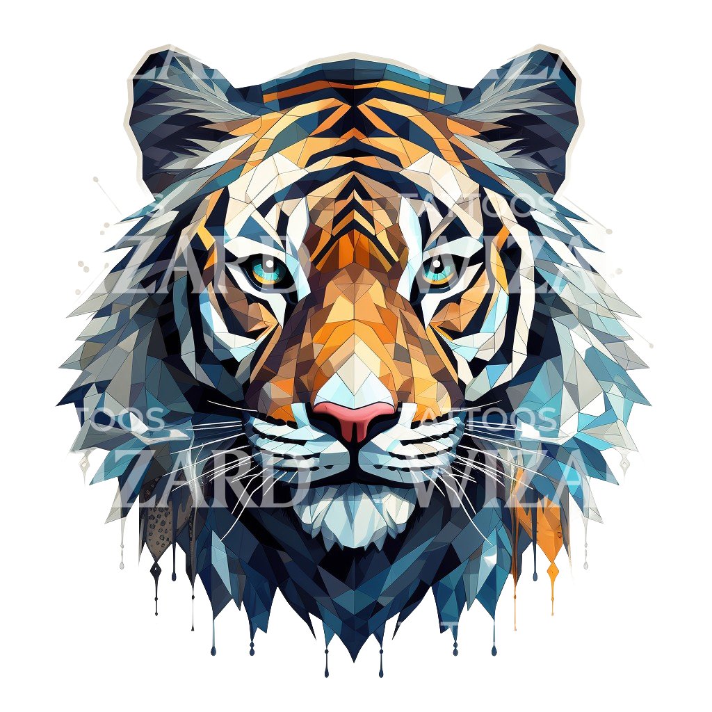 沉浸在我们几何老虎头纹身的原始美感中。该设计以生动的色调和精确的线条呈现,融合了野生动物的威严与现代美学。非常适合那些对力量和艺术本质感兴趣的人,封装在动物之王的象征中。