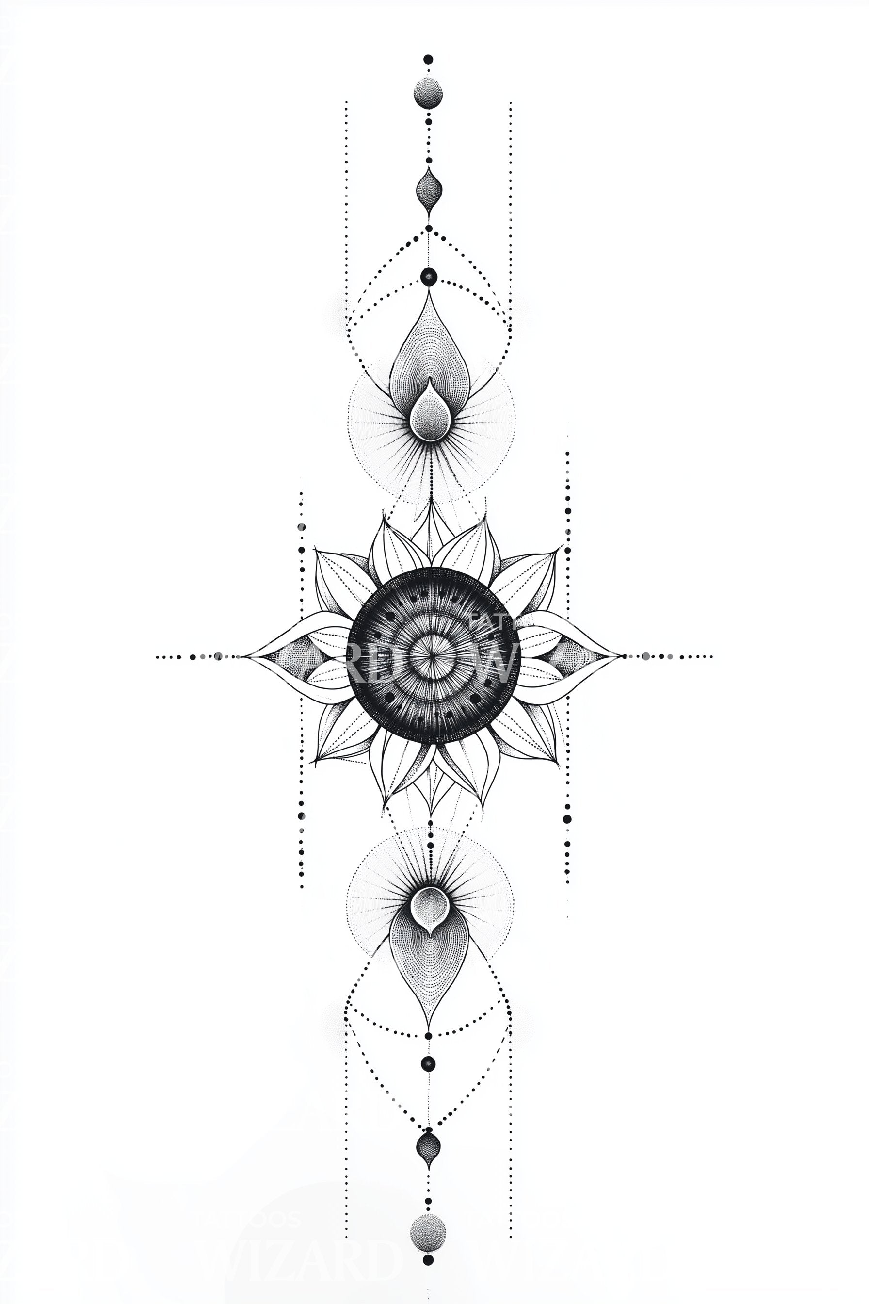 Sacred geometry blooms in a compass-like mandala, petals radiating from a detailed central wheel with a cardinal cross, flanked by teardrop orbs and delicate dotwork arcs. Symbolizing true north and cyclical harmony, the design honors balance and awakening. Worn on skin, it feels centering, luminous, a map to calm.