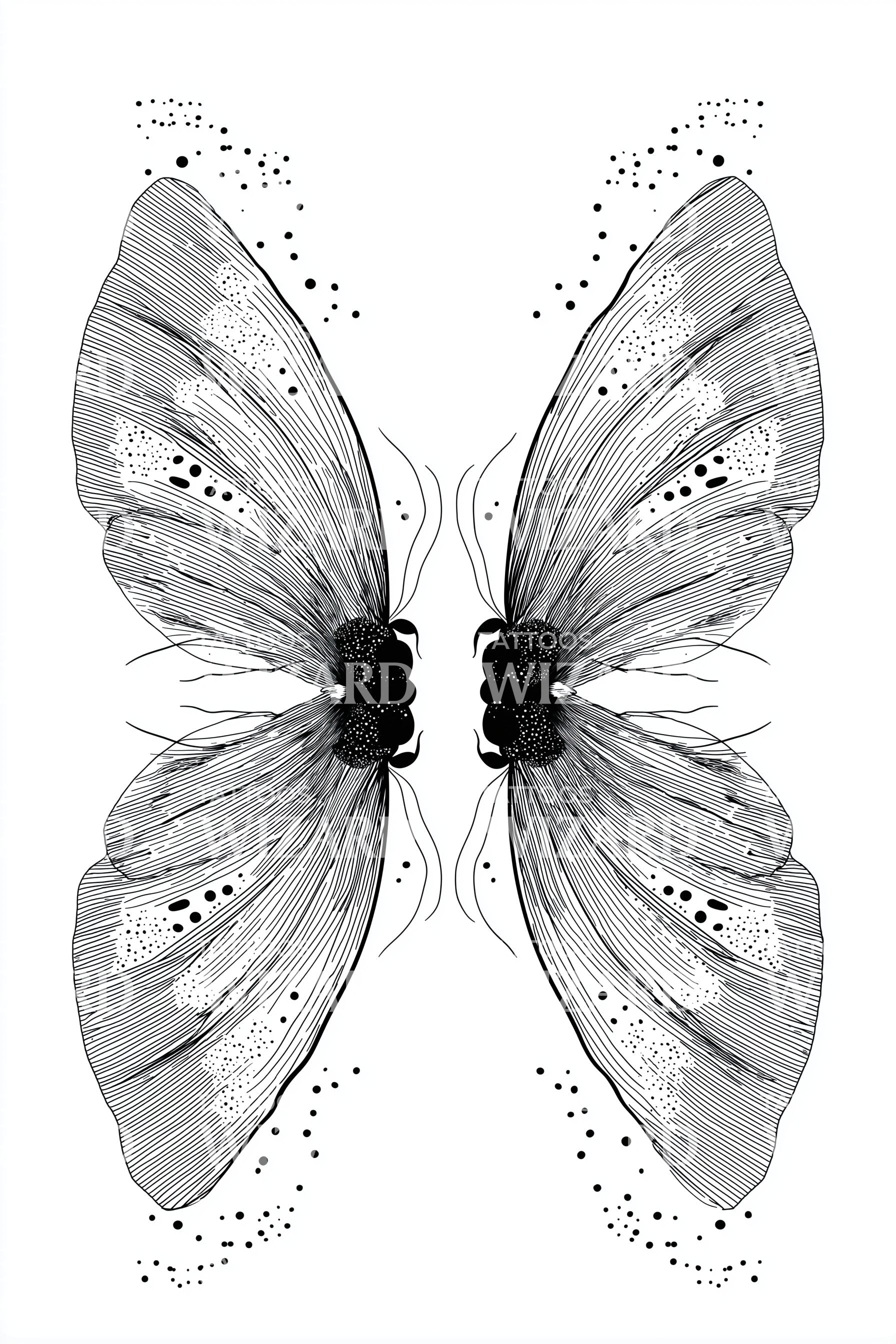 这款精致的纹身设计展现了一只玻璃翼蝴蝶在镜中倒影的惊艳对称融合。以引人注目的细线细节精心绘制,设计体现了优雅与脆弱。对于任何被温柔而迷人的纹身艺术吸引的人来说,都是一个美丽的选择。