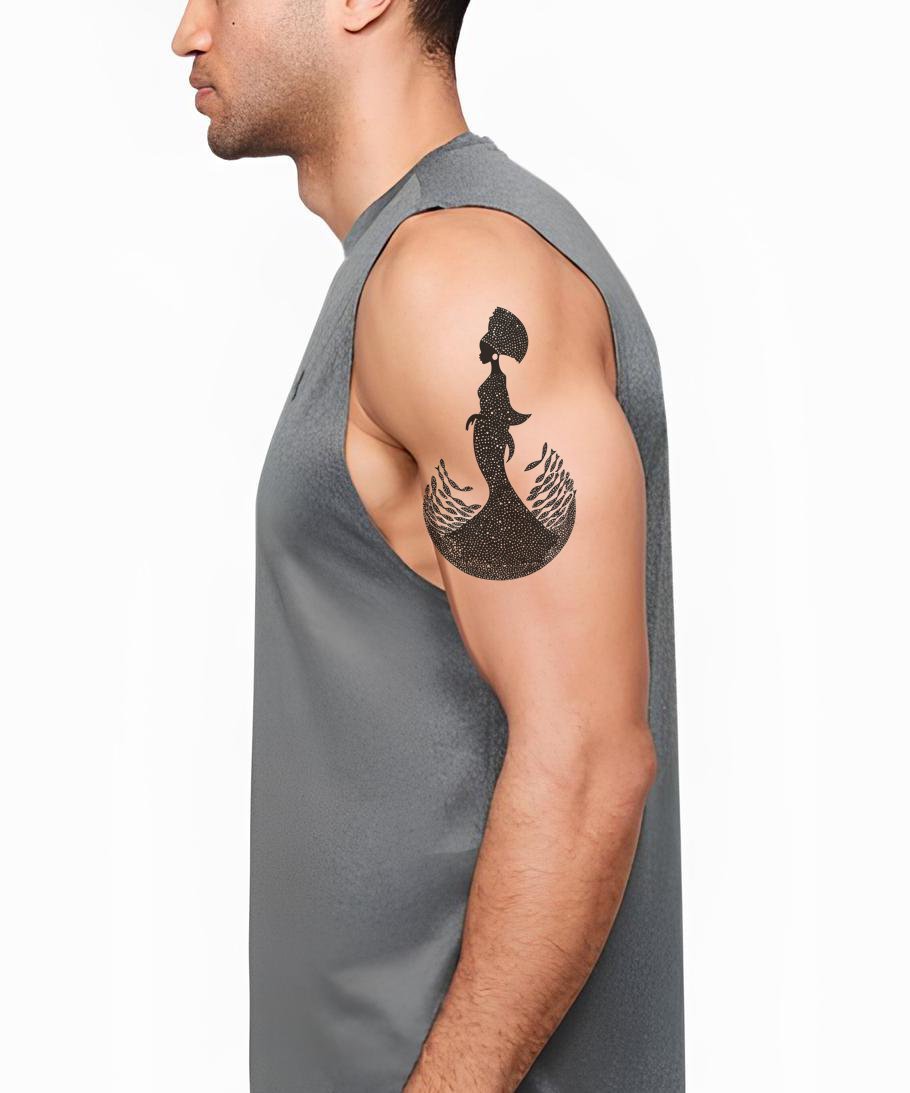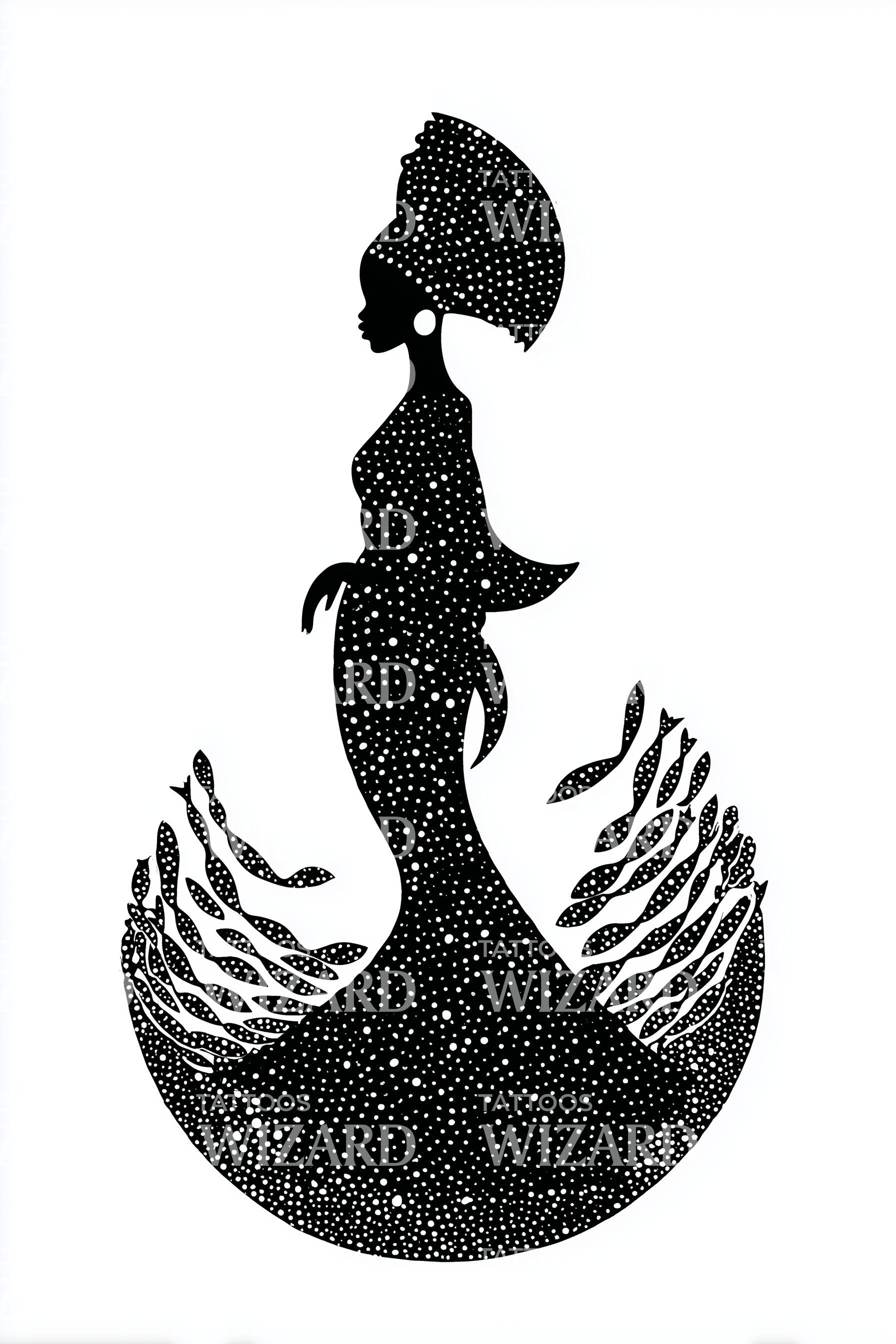 约鲁巴海洋女神的装饰性剪影,头戴盖勒头巾,她那星光点缀的美人鱼形态被流动的鱼群环绕。象征祖先的恩典、水的智慧和女性的主权。佩戴者感到宁静、优雅且受保护。理想位置:前臂适合渐细造型;小腿适合竖直流动;肋骨适合新月形基座;脊柱适合庄重的长度。