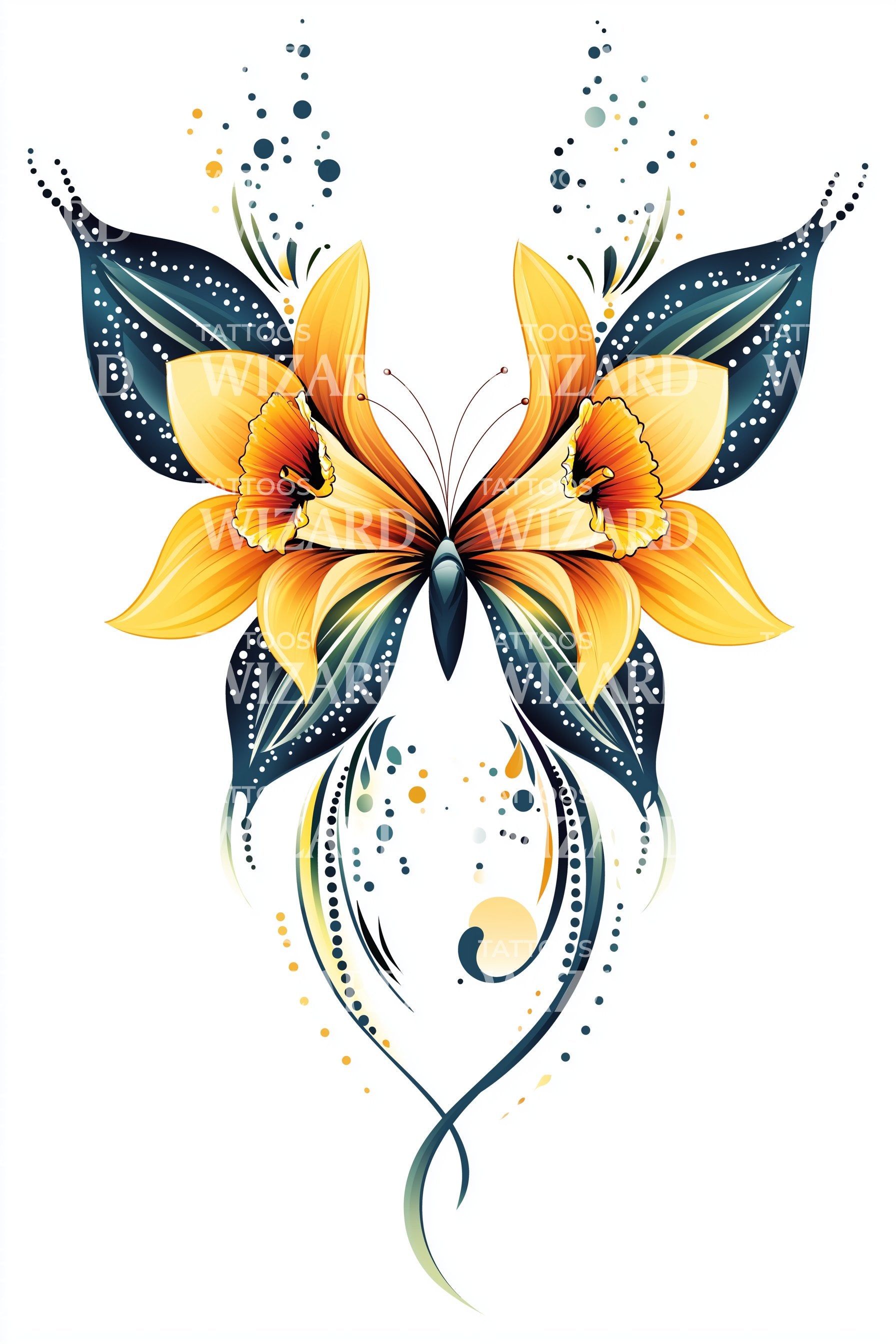 这款充满活力的新派纹身设计融合了优雅与锋芒。以一朵金色百合为中心,作品绽放出复杂的旋涡,捕捉花朵优雅的美感。其华丽的花卉美学必将吸引目光,将优雅编织成大胆的纹身艺术展示。