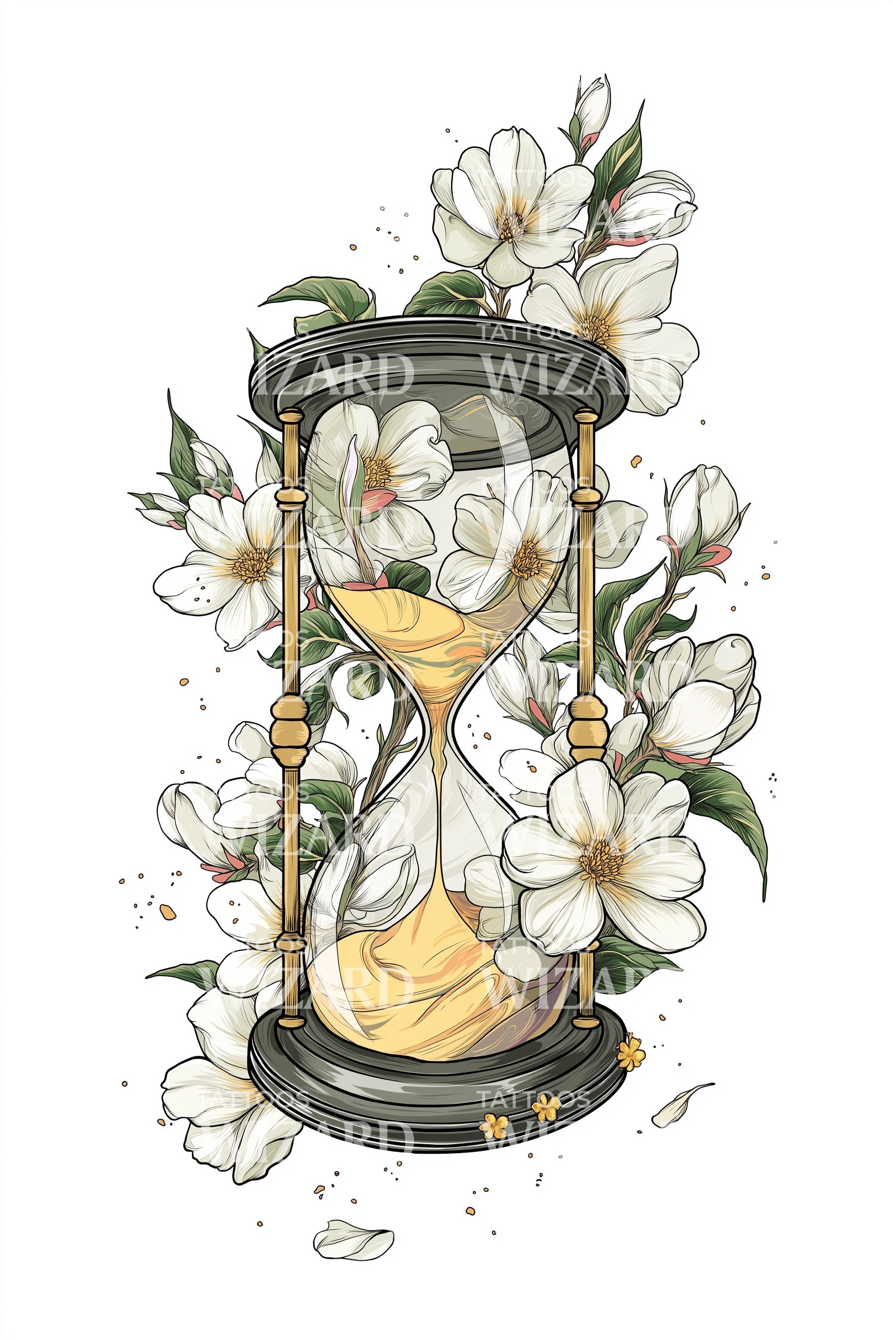 这款优雅的纹身设计巧妙地融合了金色调,打造出独一无二的杰作。它以沙漏象征时间,精细地与美丽的鸡蛋花交织在一起——向生命的短暂本质致敬。此设计散发出永恒的气息,非常适合追求优雅气质的您。