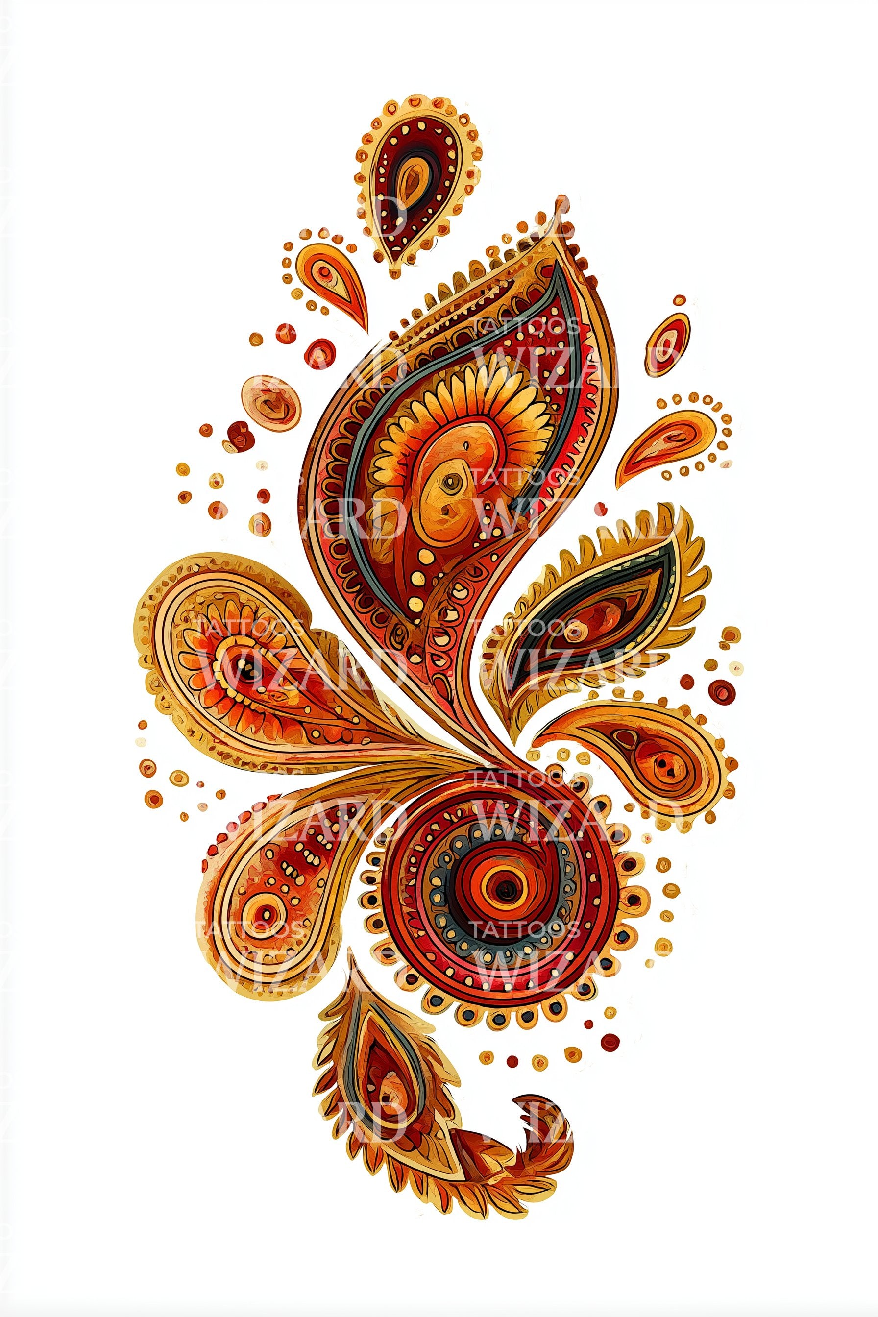 沉醉于这款装饰性纹身设计的精致美感。以华丽的金色装饰的复杂佩斯利图案为特色,搭配令人愉悦的花卉图案。这款受东方启发的优雅设计,为您的身体艺术收藏增添了永恒的魅力与奢华。