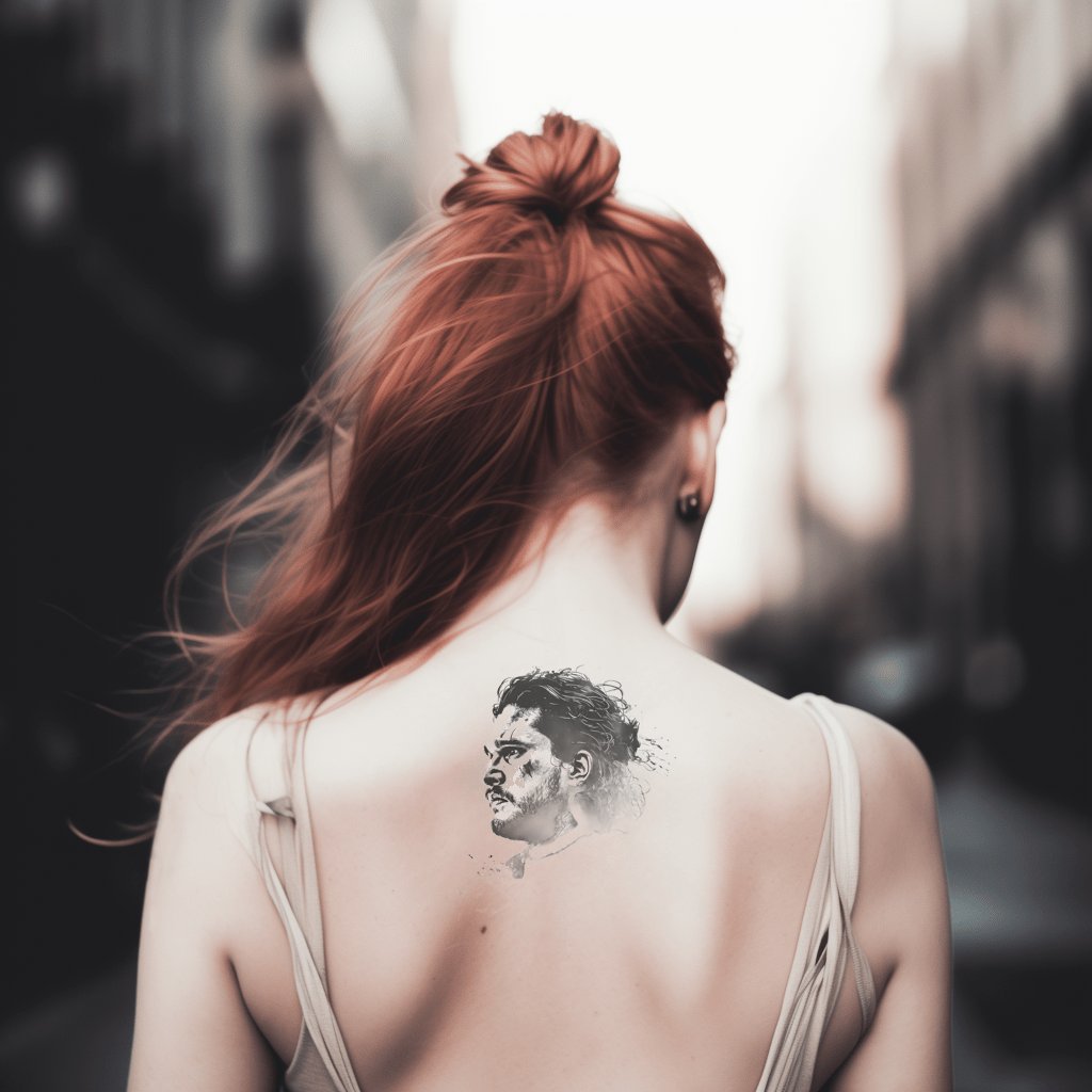 沉浸在维斯特洛的世界中,欣赏这款引人注目的琼恩·雪诺纹身设计。精心制作的黑白灰色调,生动地捕捉了史塔克继承人的肖像,独特地体现了北方的坚韧和决心。对于任何《权力的游戏》和HBO系列爱好者来说,都是完美的收藏品。