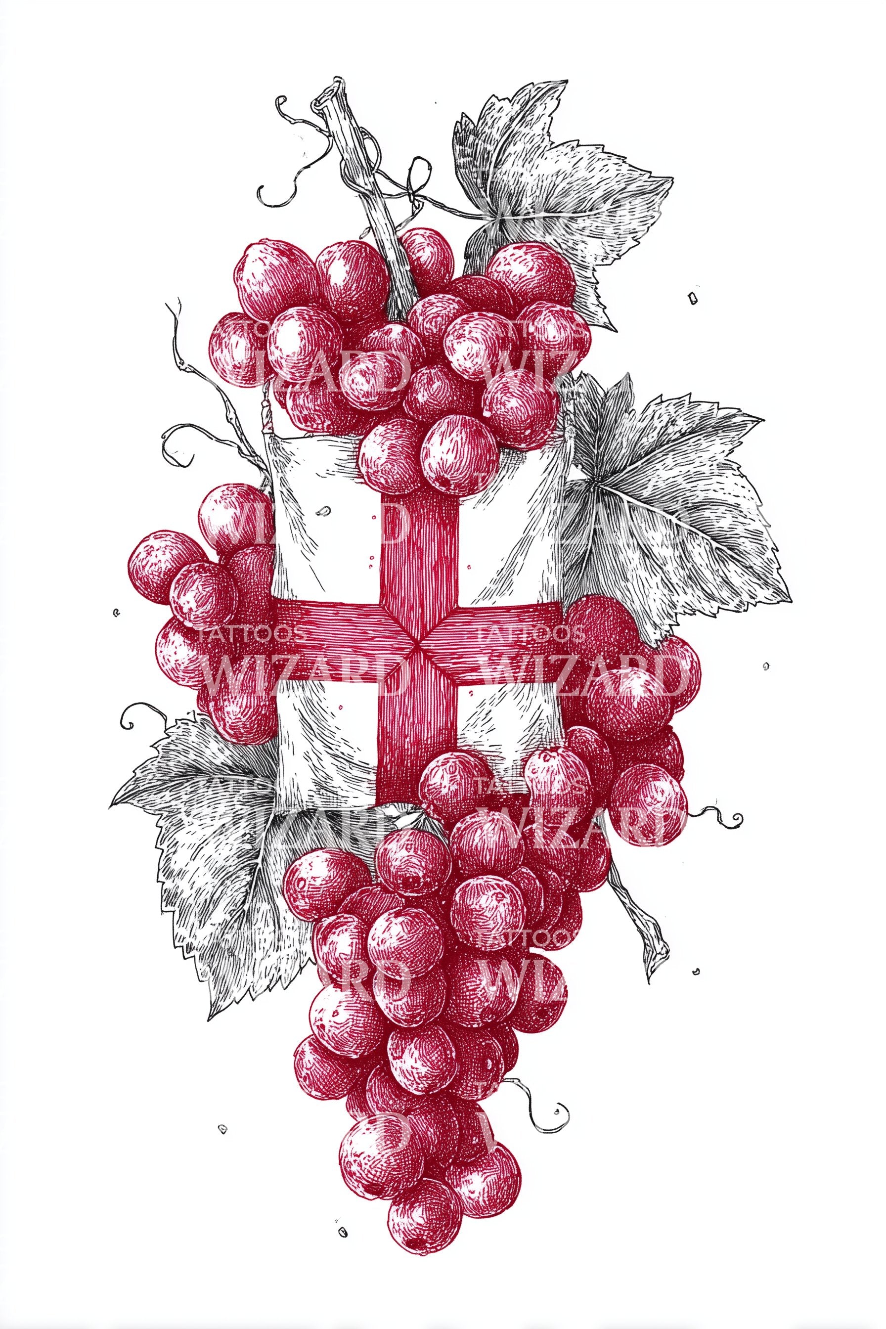 这款纹身设计精致华美,展现了格鲁吉亚象征的力量。优雅的葡萄串象征丰饶,而坚定的十字架象征信仰。酒红色调增添了与格鲁吉亚纹章相呼应的深厚韵味。它是传统与风格的独特融合,如同飘扬的州旗。