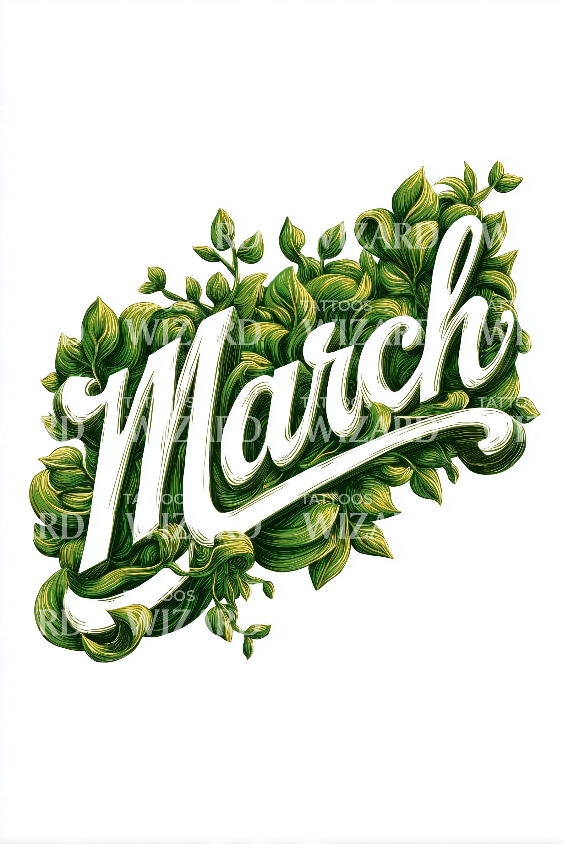 March blooms in neotraditional flourish: creamy calligraphy lettering wrapped in lush green leaves, each stroke alive with spring light. The foliage symbolizes renewal, patience, and steady growth, a month of thresholds. Wearing it feels like carrying fresh air on skin, courage to begin again, roots deep, spirit forward.
