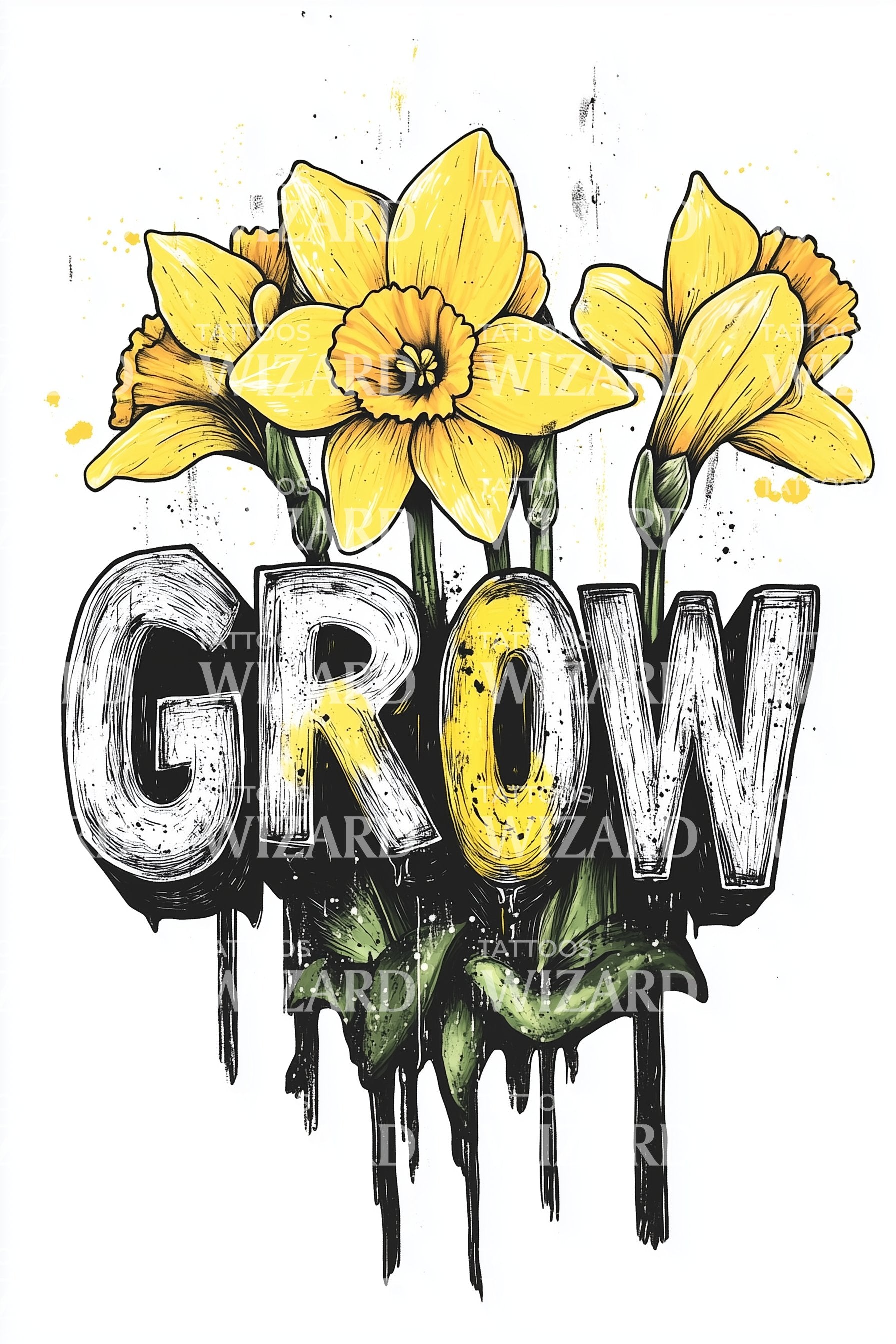体验我们插画风格纹身设计中绿意盎然的植物之美。以大自然的水仙花为点缀,配以优雅的字体,诠释成长的深刻主题。在你的肌肤画布上,绽放一封献给自然的情书,提升你的美学品味。